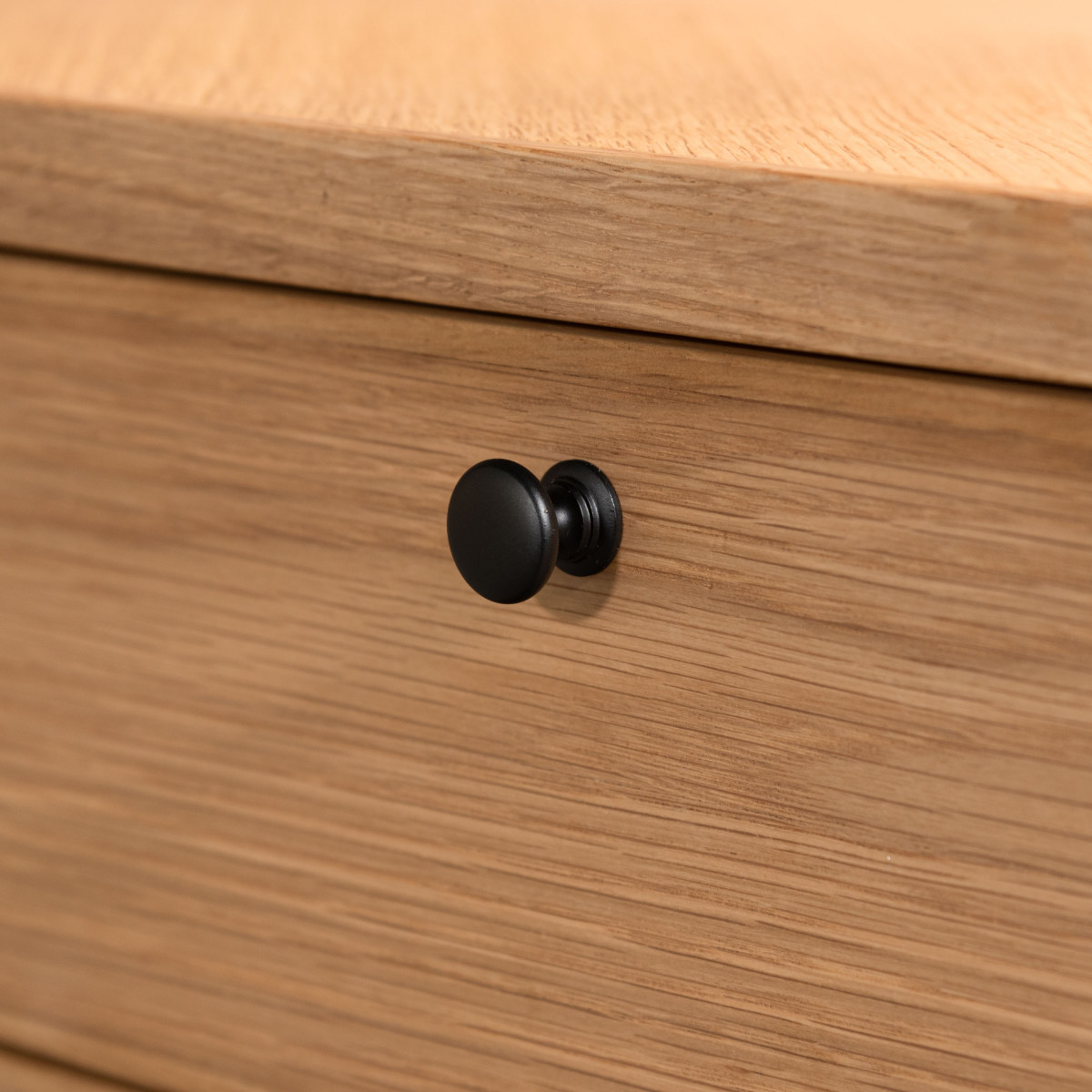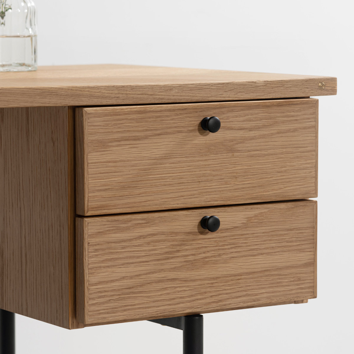 サイドに引き出しが2段ついています。引き出しには控えめで上品な可愛らしさの取っ手付き。引き出しは左右どちらにでも取り付け可能なので、利き手やレイアウトに合わせて使いやすく、作業もスムーズに行えます。