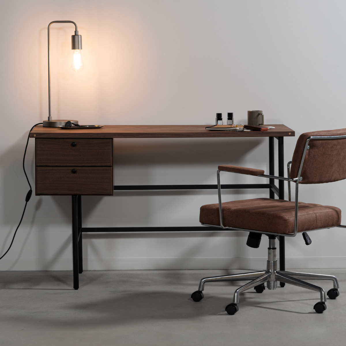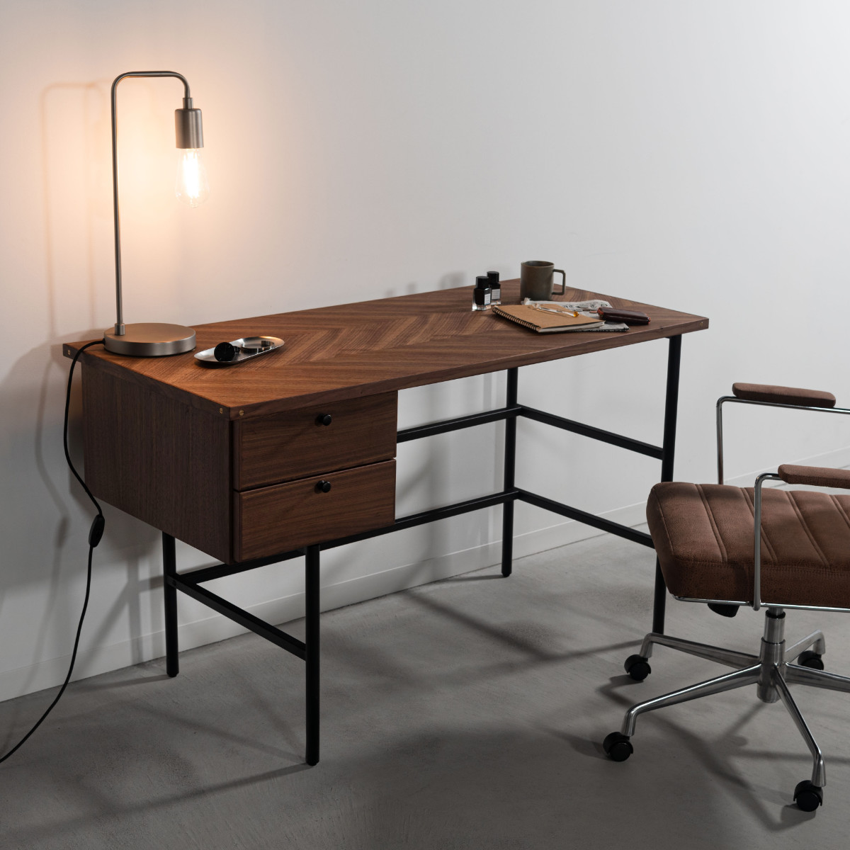 form パソコンデスク 幅120cm 引き出し付き ジュニパー ( 木製 天然木 デスク 机 ワークデスク 平机 学習机 勉強机 収納付き 引出し 2段 奥行55cm 学習デスク パソコン PC スチール脚 オフィス 会社 木製デスク ) 【ブラウン】