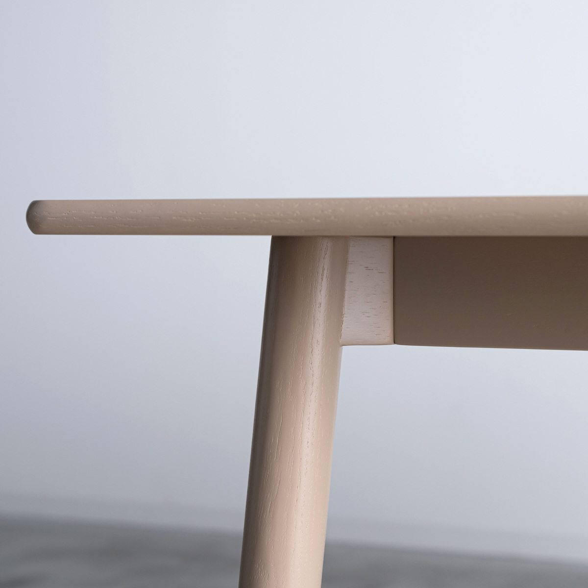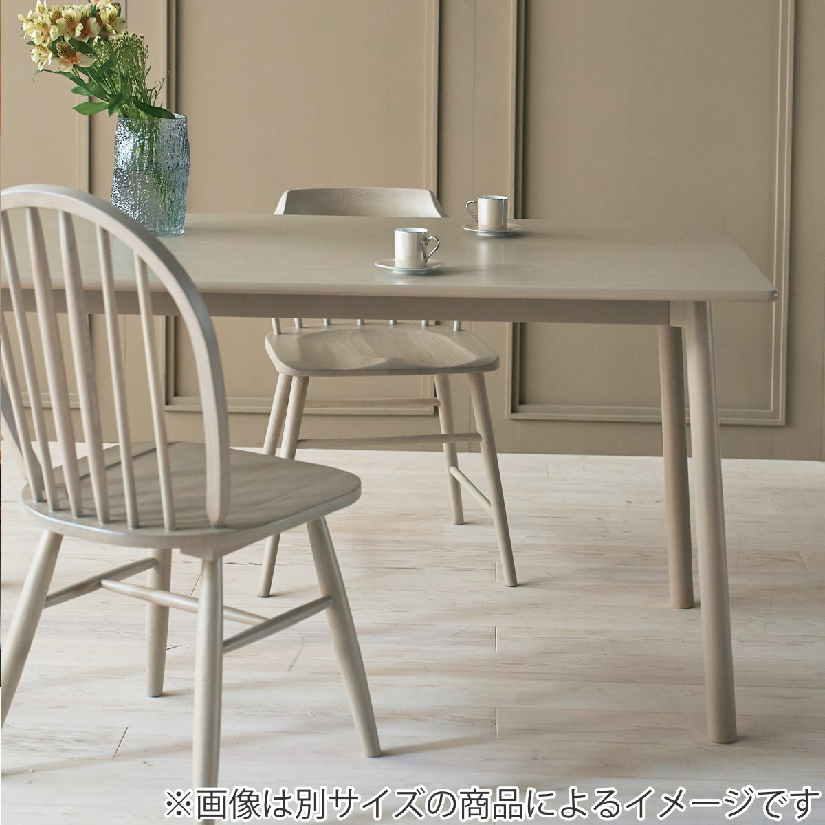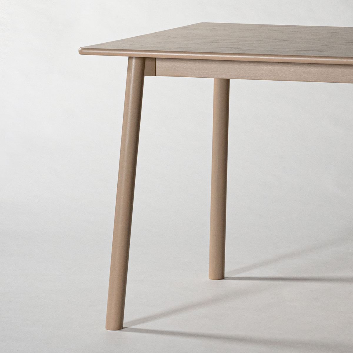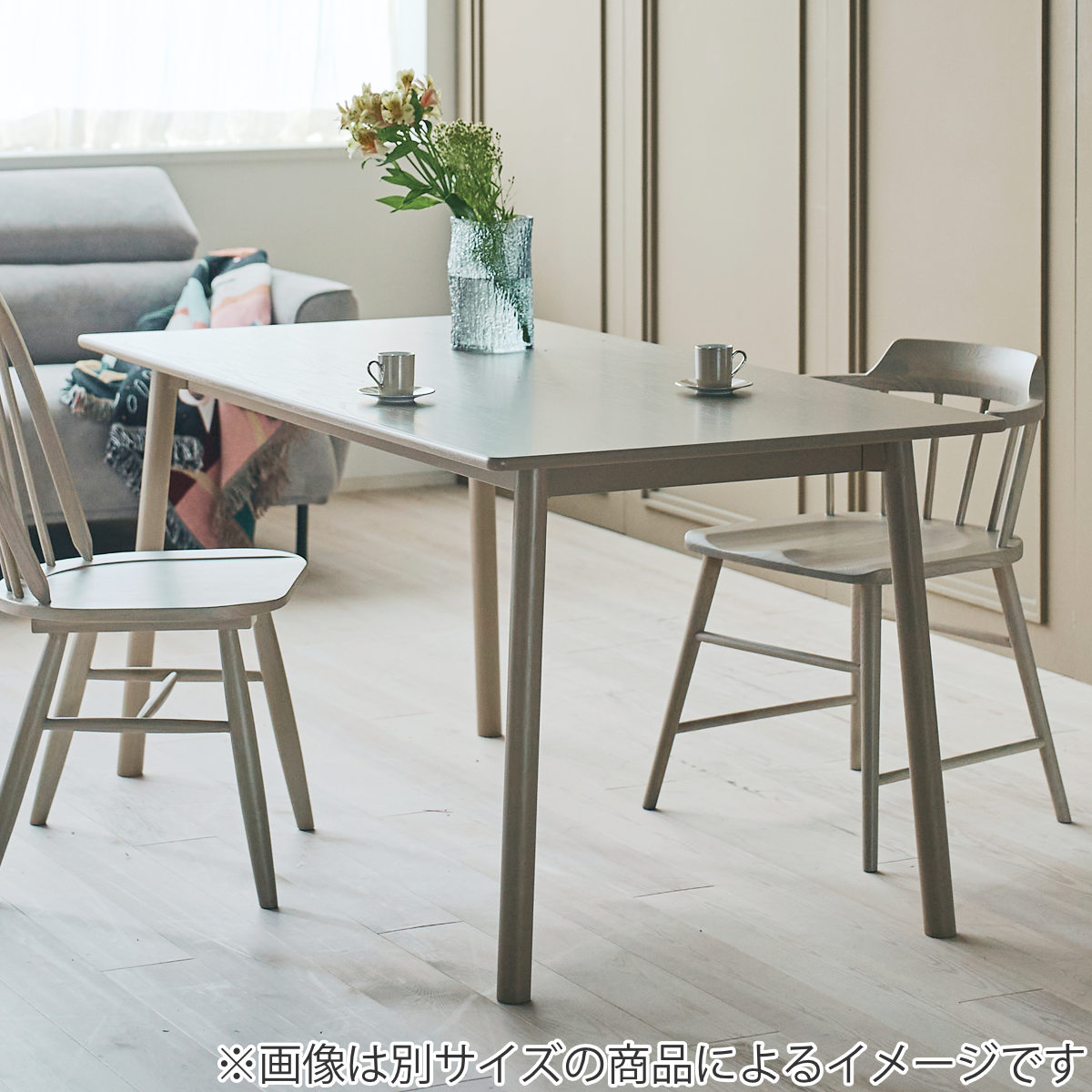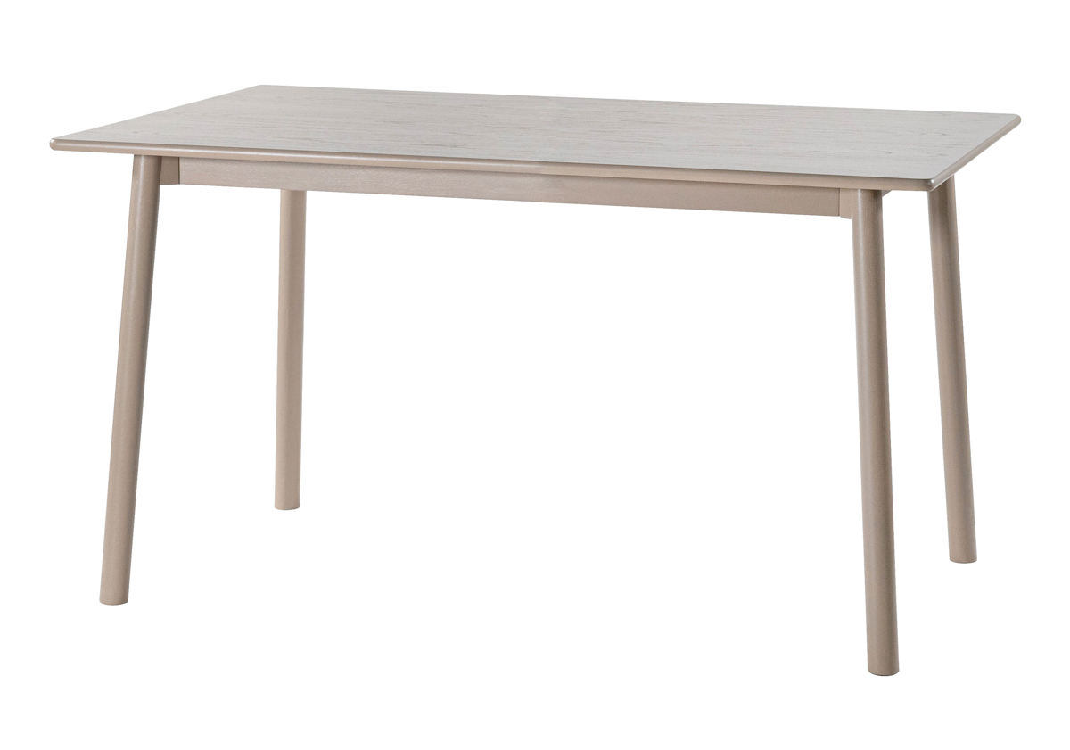 全体的に角を丸くし、やさしい雰囲気に仕上げたオーク材のダイニングテーブルです。落ち着いたグレージュカラーで、ナチュラルなインテリアや北欧テイストのお部屋にもよく合います。