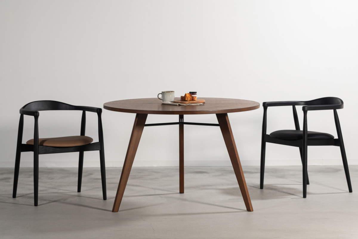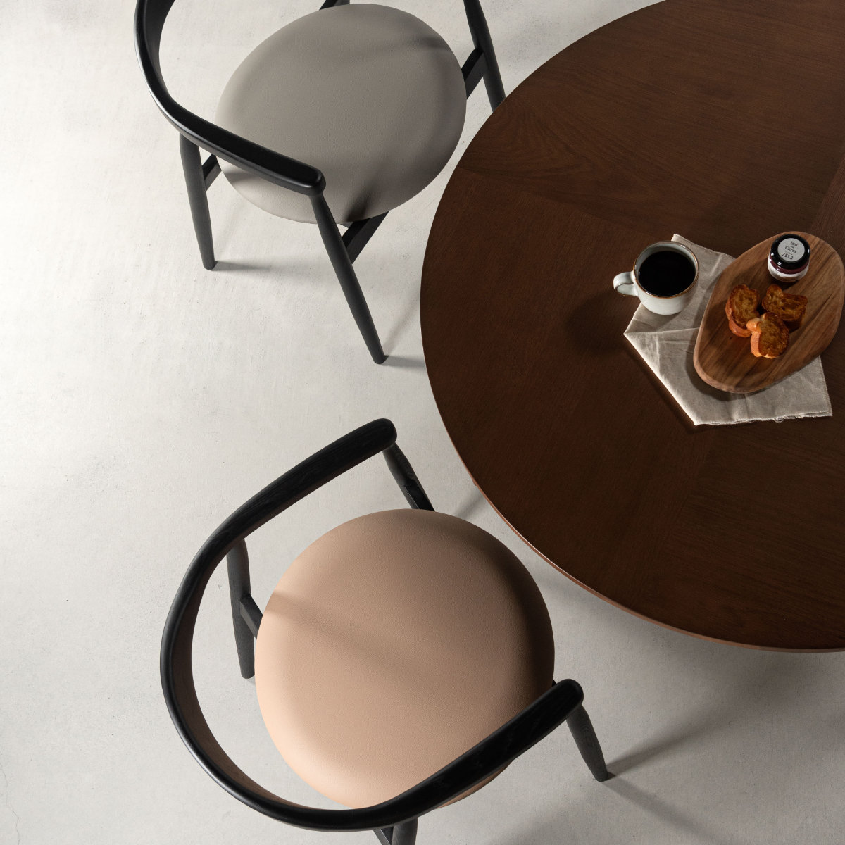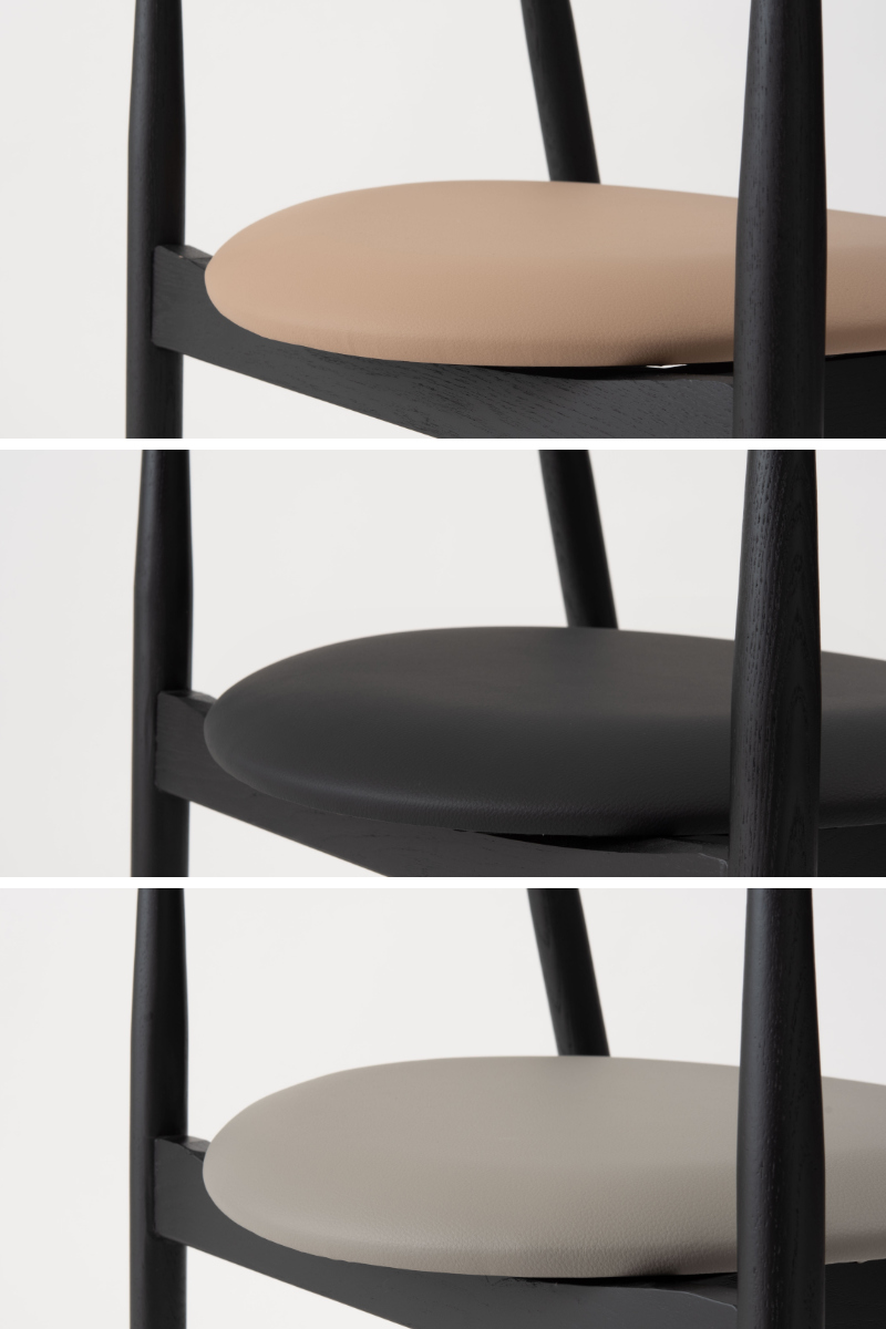 3色から選べる合皮シートは、空間に自然と馴染む上品な色合いです。ブラックの天然木フレームと組み合わさることで、スタイリッシュな印象に。また、合皮は汚れに強くお手入れしやすいため、毎日のダイニング使いにも適しています。