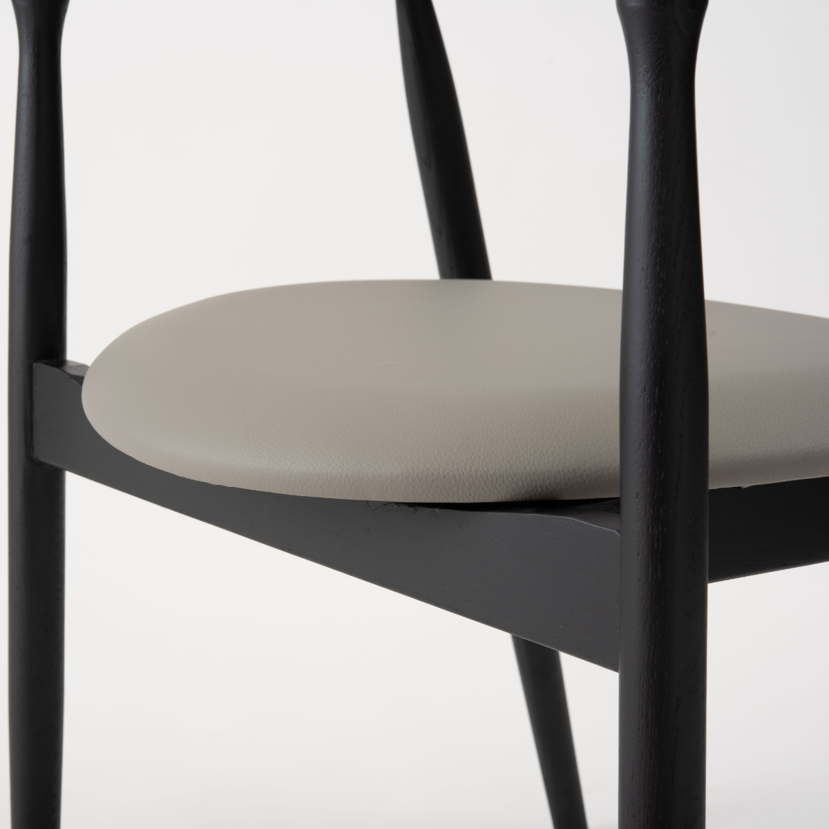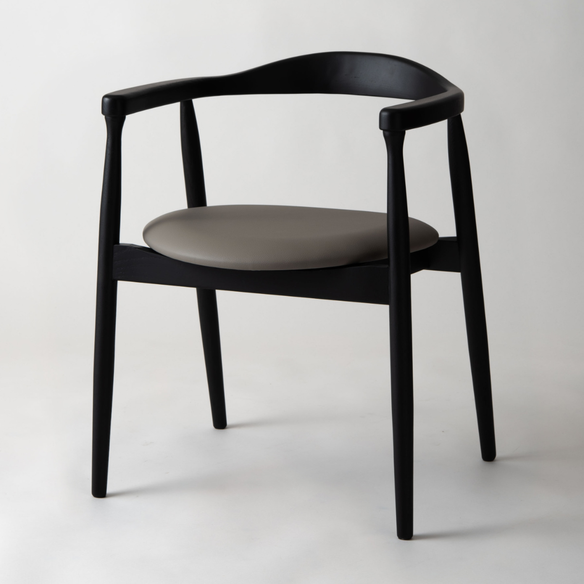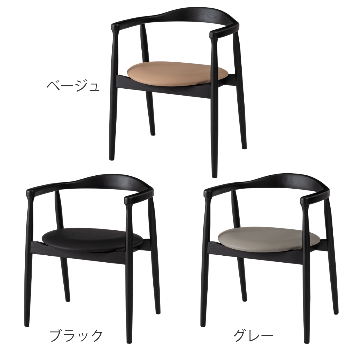 上品な印象の合皮と、アッシュ天然木のコントラストが美しく調和したダイニングチェアです。背とアームはエッジを落とした曲線仕上げに。丸みを帯びた脚部と相まって、どこから見ても、しなやかなフォルムに仕上げています。