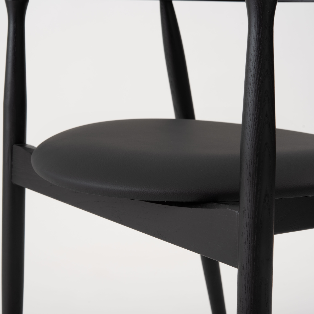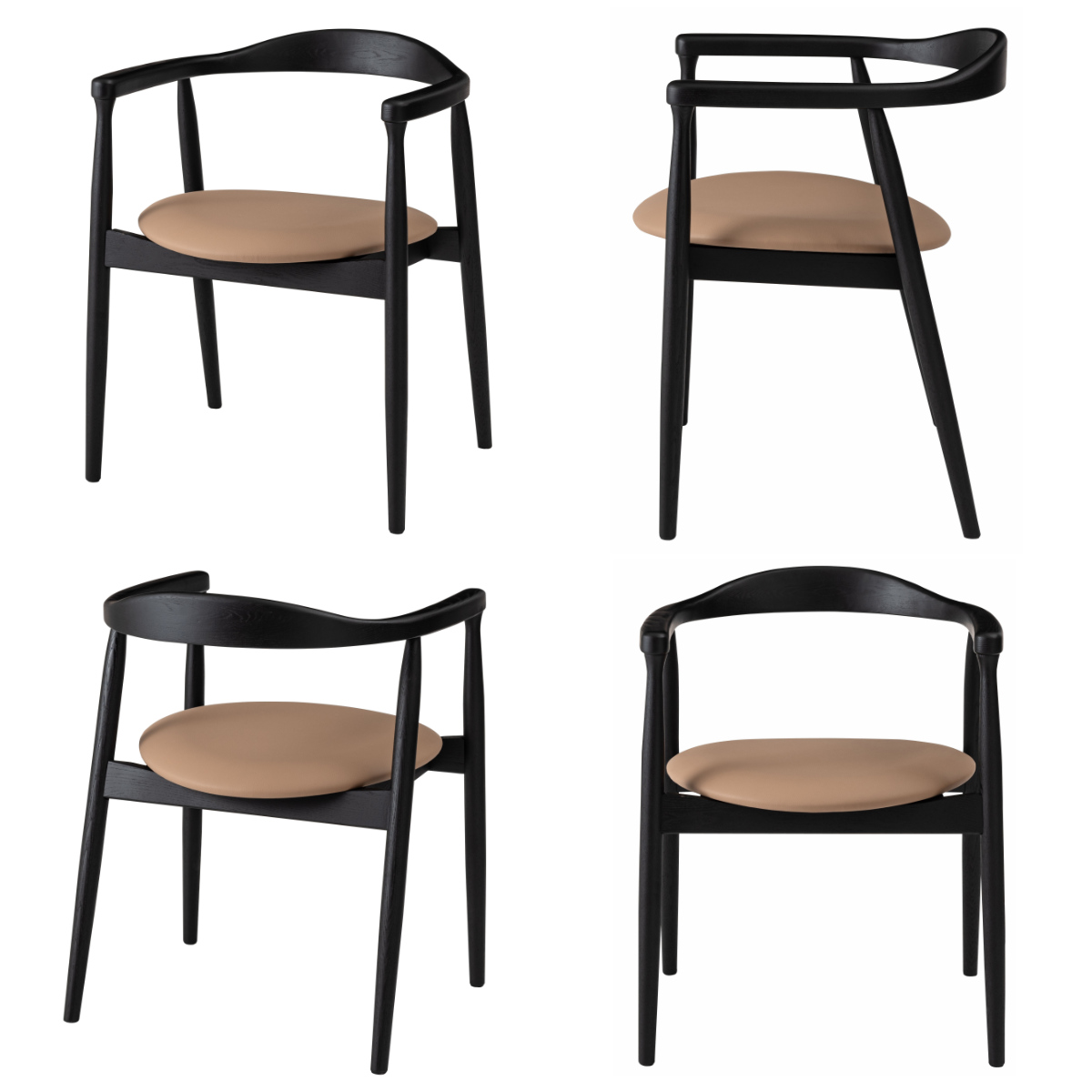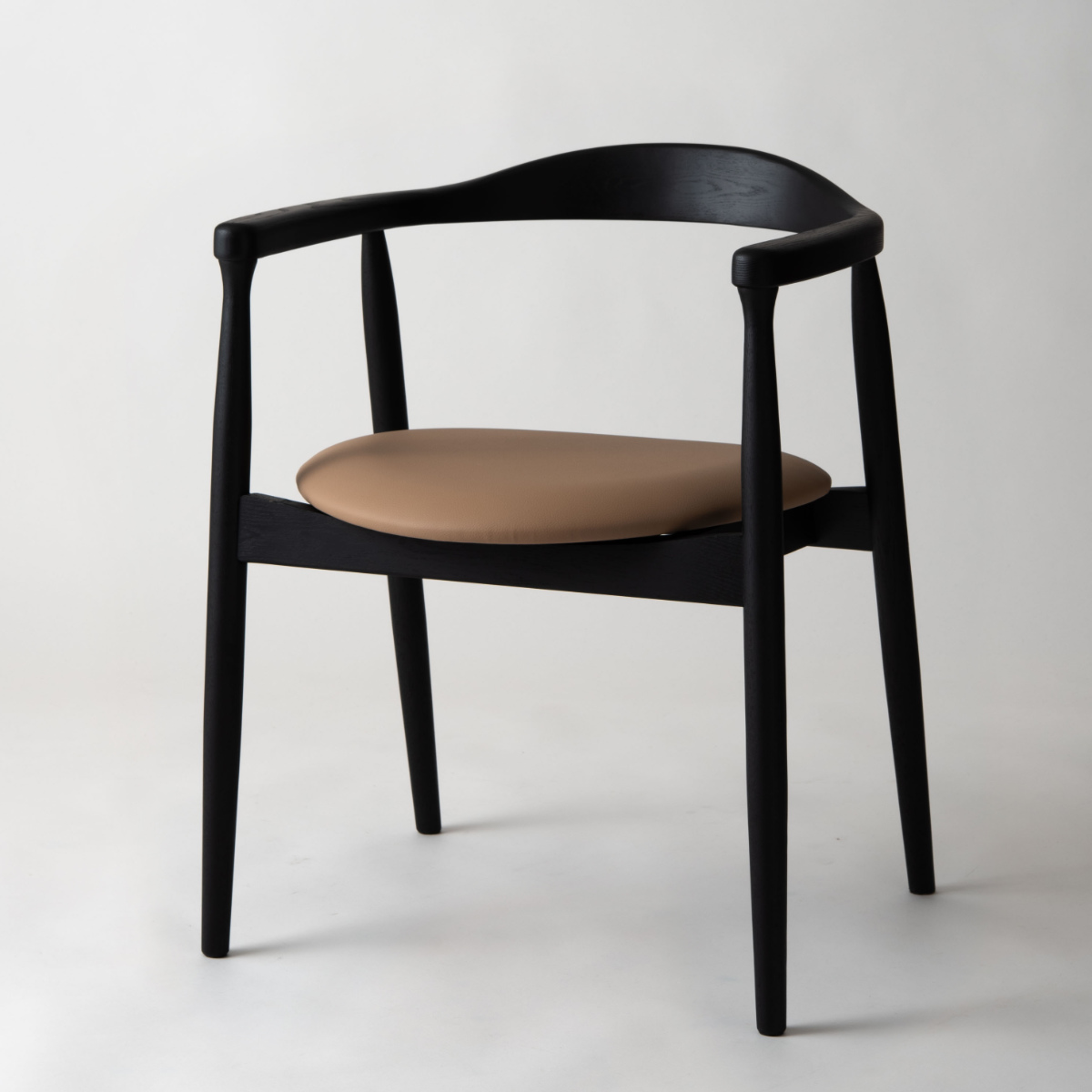 上品な印象の合皮と、アッシュ天然木のコントラストが美しく調和したダイニングチェアです。背とアームはエッジを落とした曲線仕上げに。丸みを帯びた脚部と相まって、どこから見ても、しなやかなフォルムに仕上げています。