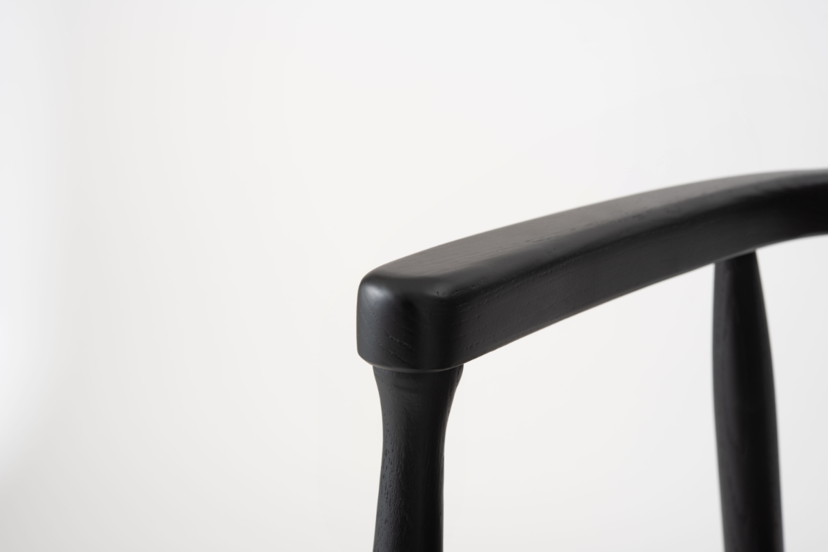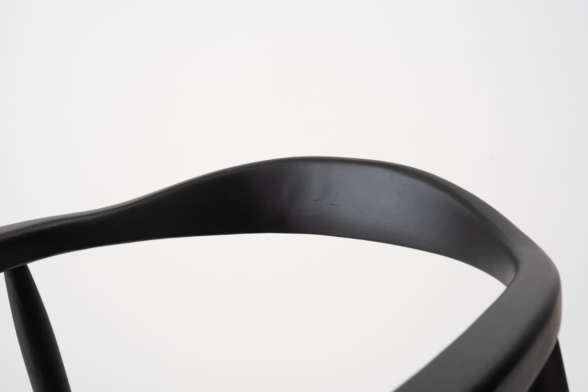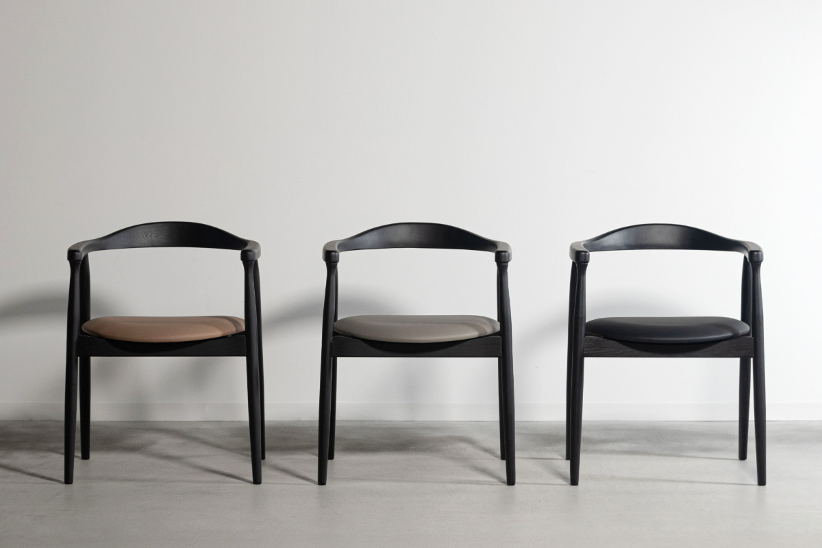 天然木の背もたれとアームは、丸みをもたせつつ細身でシャープなシルエットに。木の温かみある質感にすっきりとした印象を重ね、やさしさと洗練、その両方をあわせもつデザインに仕上げました。