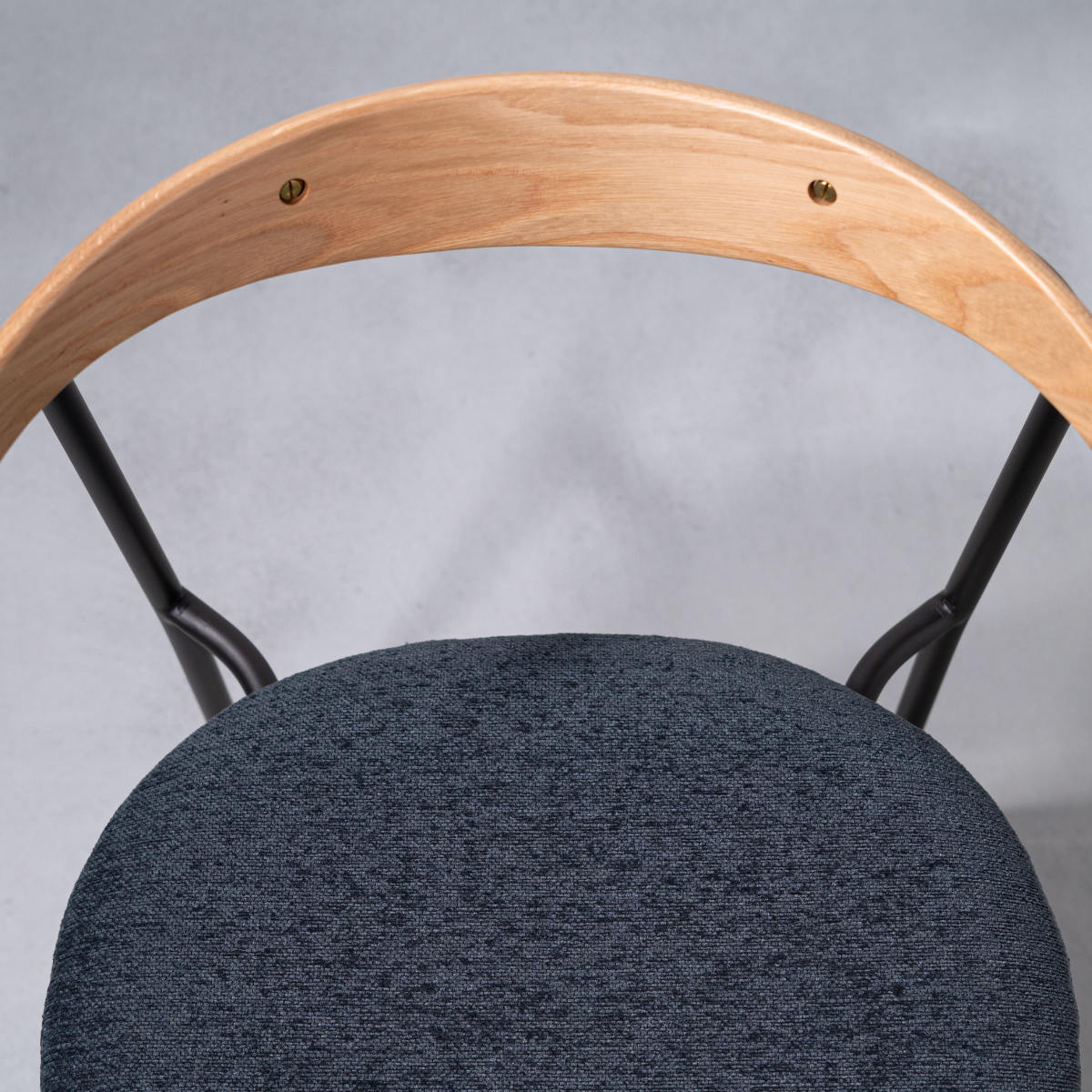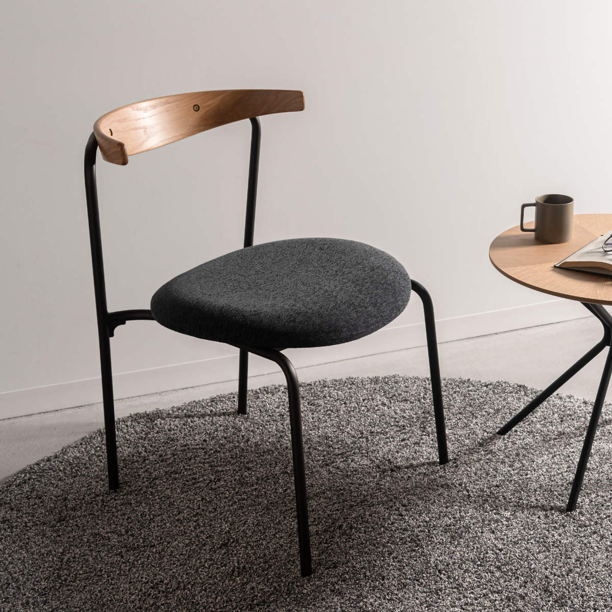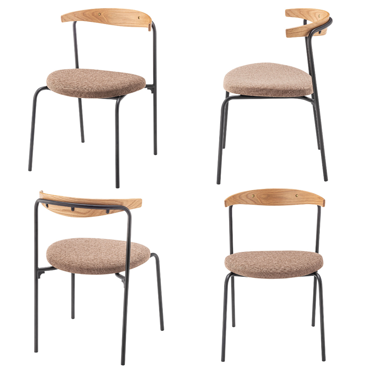 天然木の背もたれとファブリック座面、細身のスチール脚を組み合わせた、洗練されたデザインのダイニングチェアです。異素材がバランスよく調和し、それぞれの魅力が引き立つチェアに仕上げました。