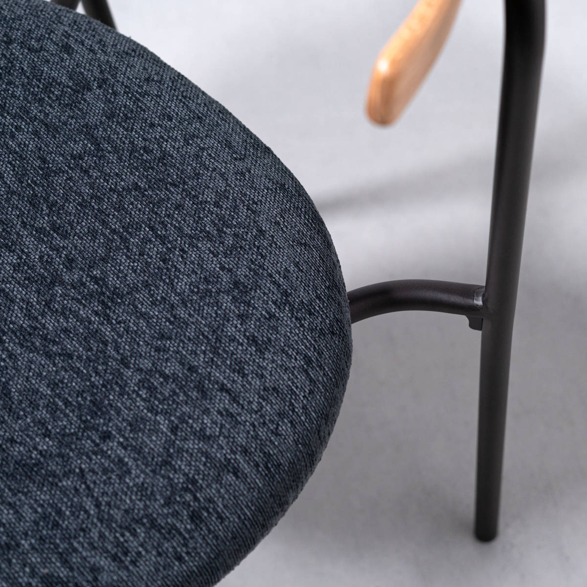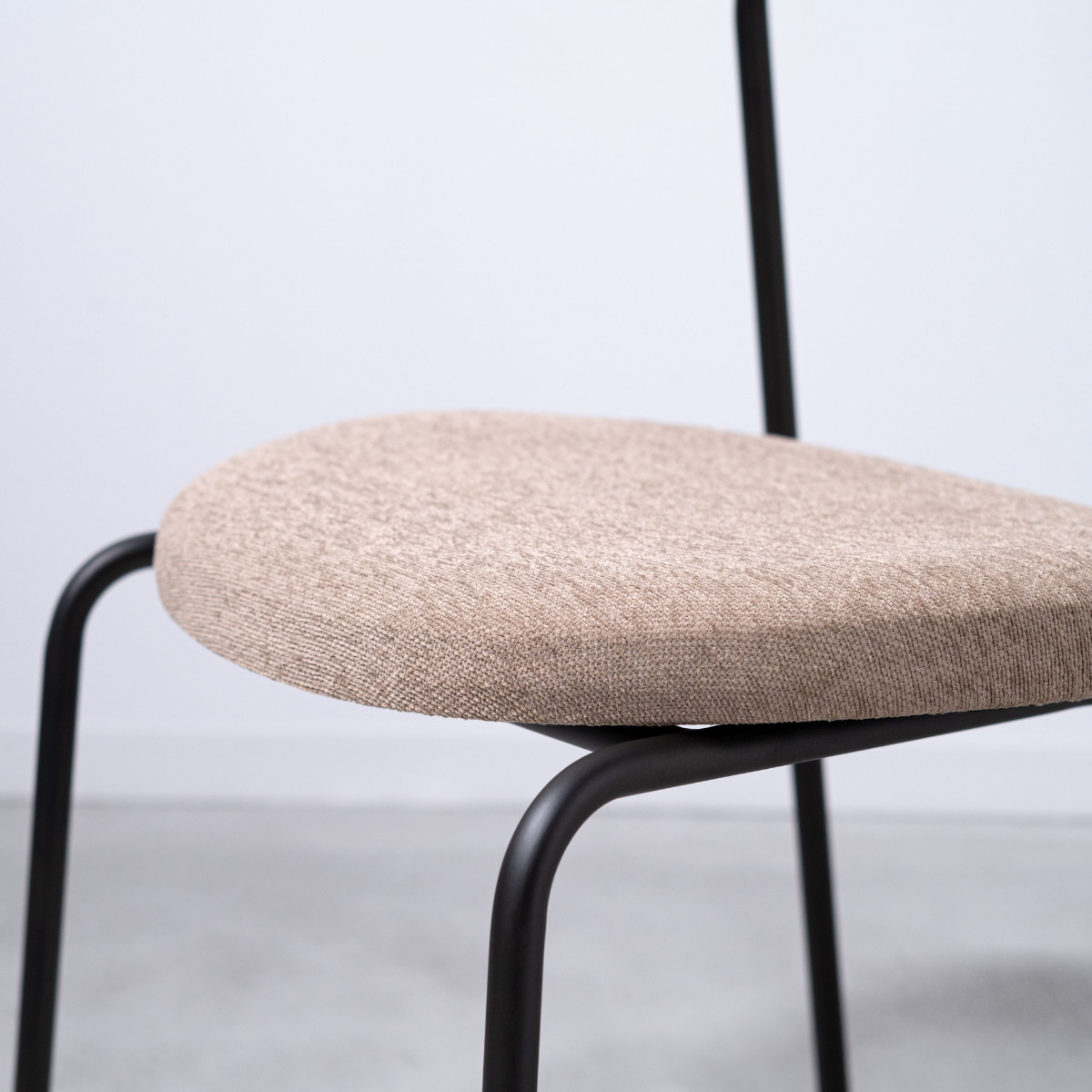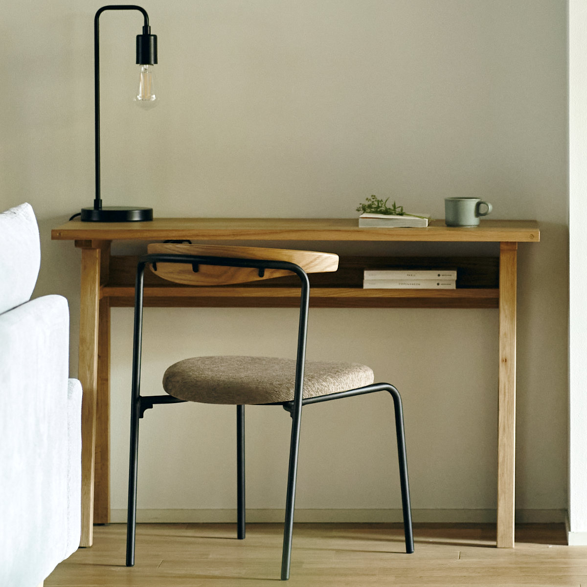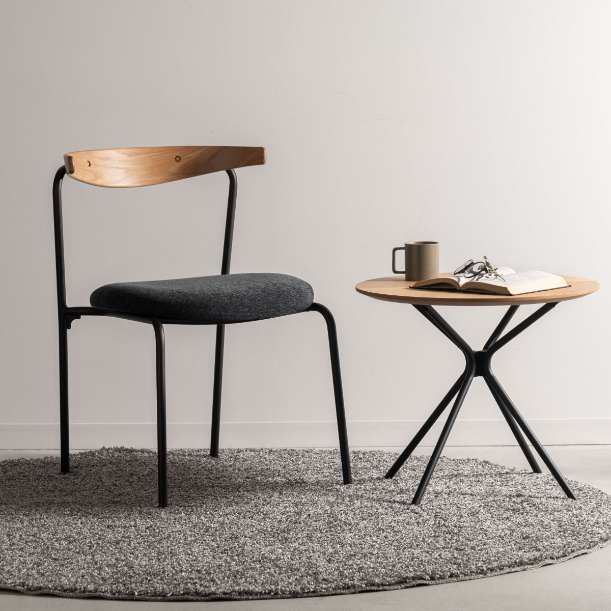 天然木の背もたれとファブリック座面、細身のスチール脚を組み合わせた、洗練されたデザインのダイニングチェアです。異素材がバランスよく調和し、それぞれの魅力が引き立つチェアに仕上げました。