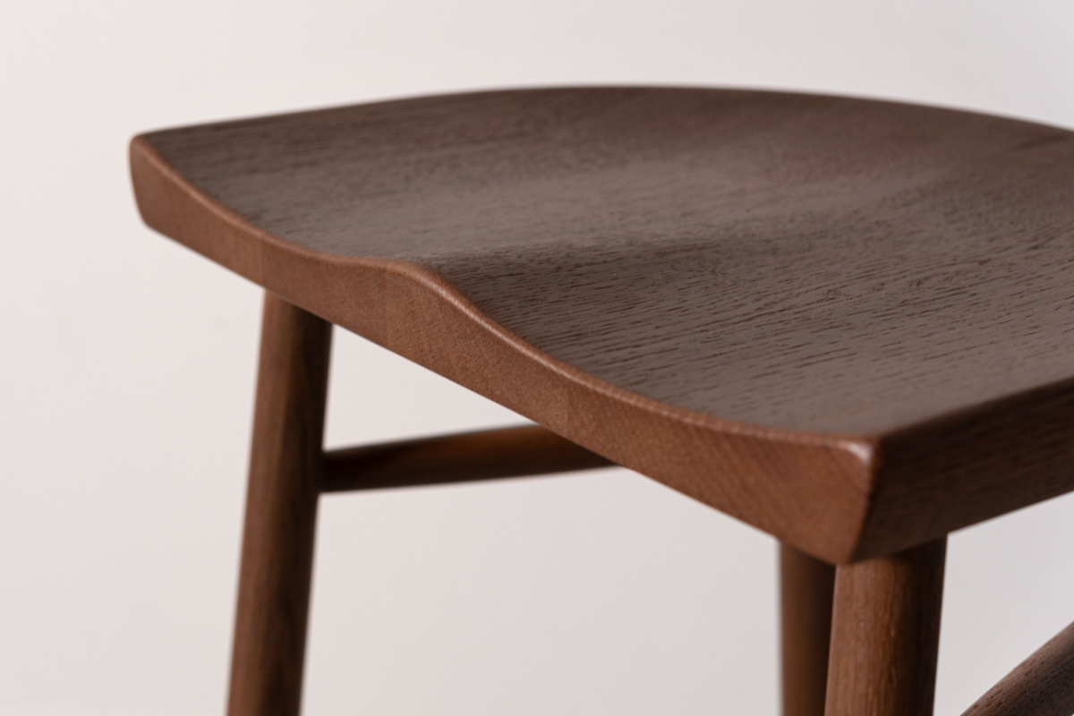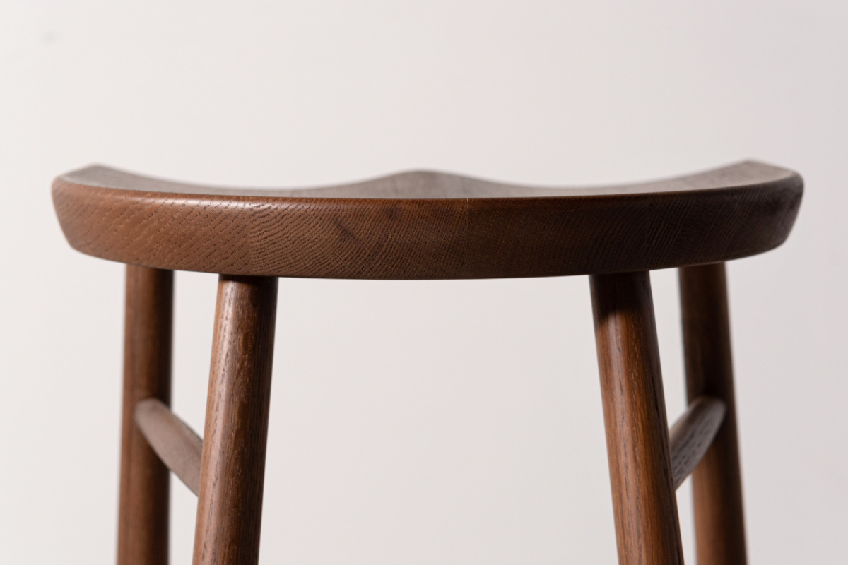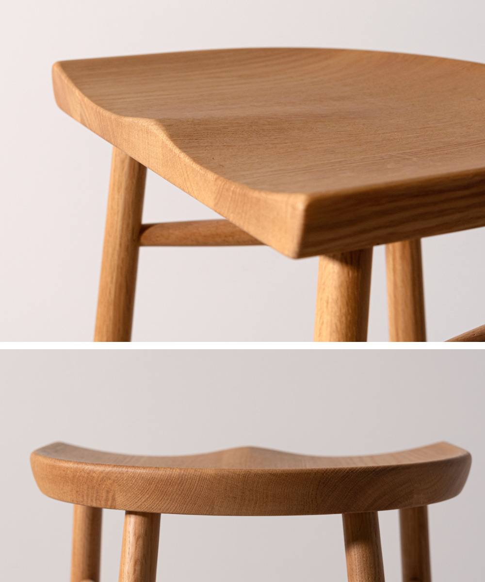 脚部まで天然木のみで仕上げ、全体に統一感がありながらも、足元にほどよいボリュームを持たせることでメリハリのある佇まいに。ぽってりとした厚みをもたせた脚部は安定感にも優れ、安心して腰掛けられるデザインです。