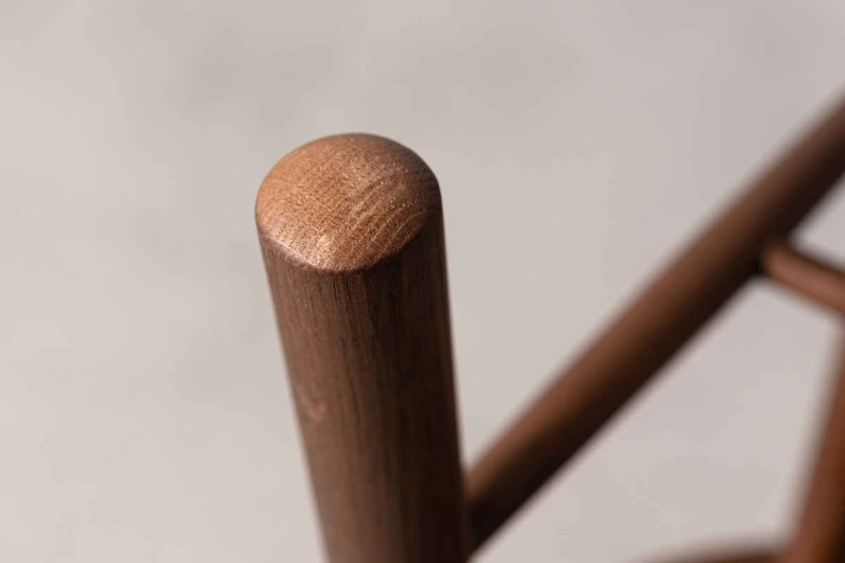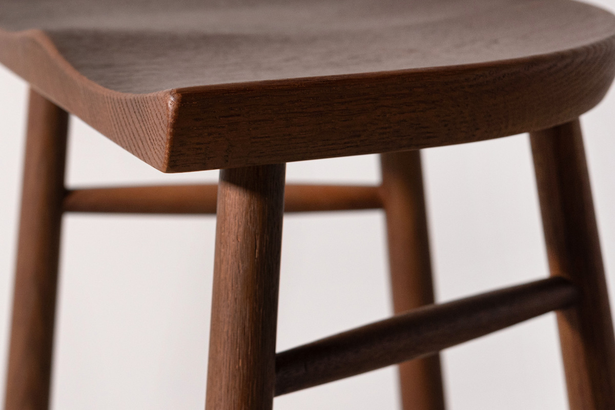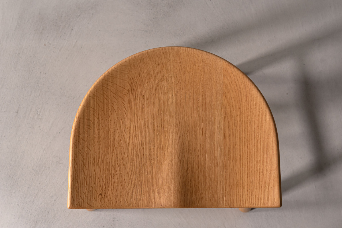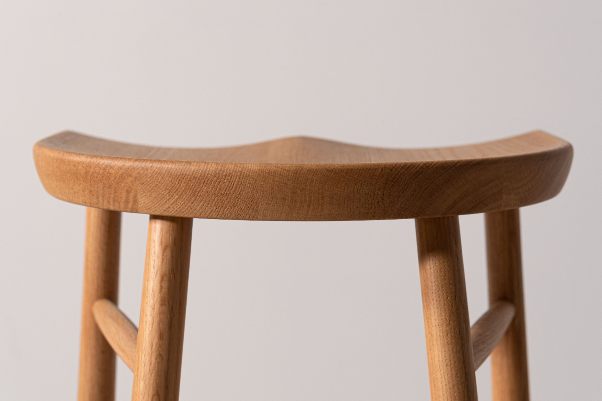 脚部まで天然木のみで仕上げ、全体に統一感がありながらも、足元にほどよいボリュームを持たせることでメリハリのある佇まいに。ぽってりとした厚みをもたせた脚部は安定感にも優れ、安心して腰掛けられるデザインです。