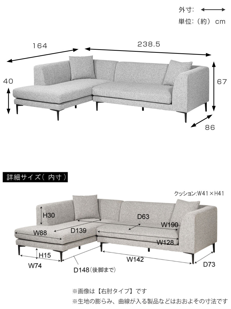 | サイズ | 約 幅238.5×奥行86×高さ67(cm) 座面高:約 40(cm) カウチ部分:奥行164cm |