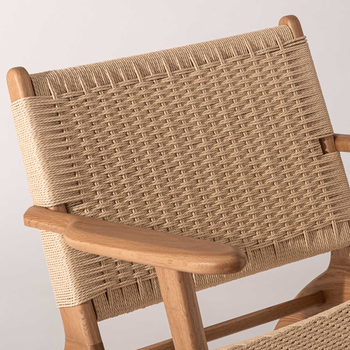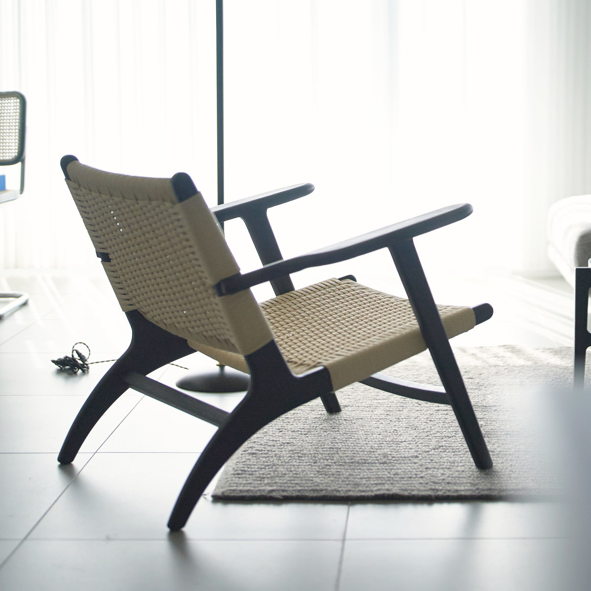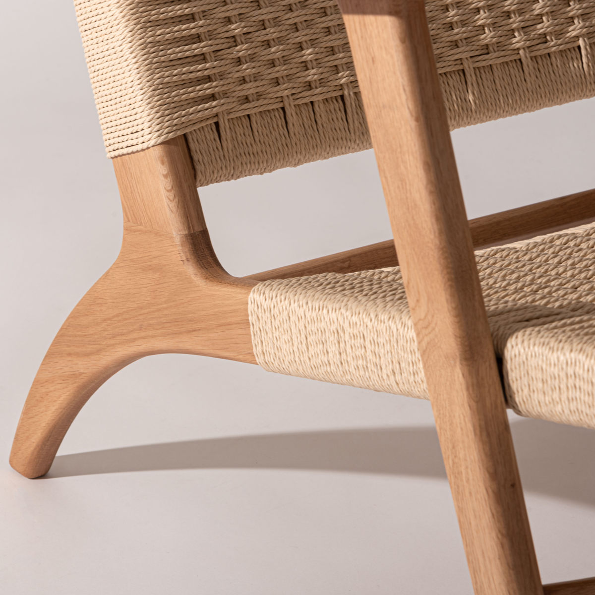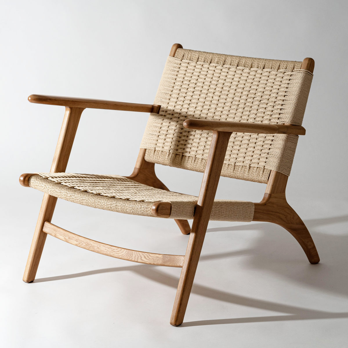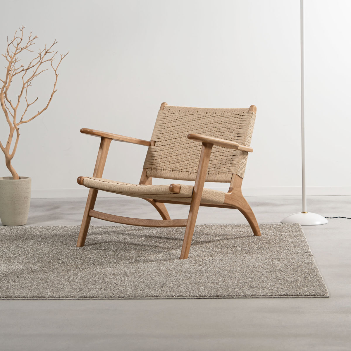 オーク材のフレームと、丁寧に編み込まれたペーパーコード座面を組み合わせたラウンジチェア。 自然素材ならではのあたたかみと、洗練された佇まいが魅力です。 シンプルながらも素材の美しさが際立ち、空間に落ち着きと品のある雰囲気を演出します。北欧テイストやナチュラルインテリアはもちろん、上質感のあるリビングや書斎にも心地よく馴染みます。