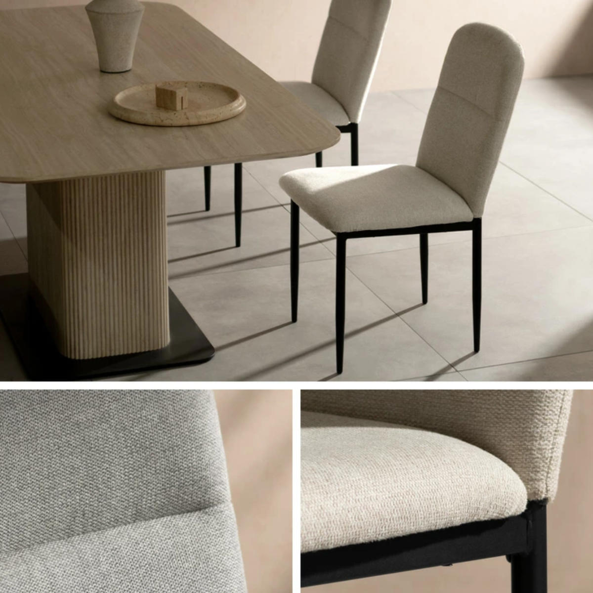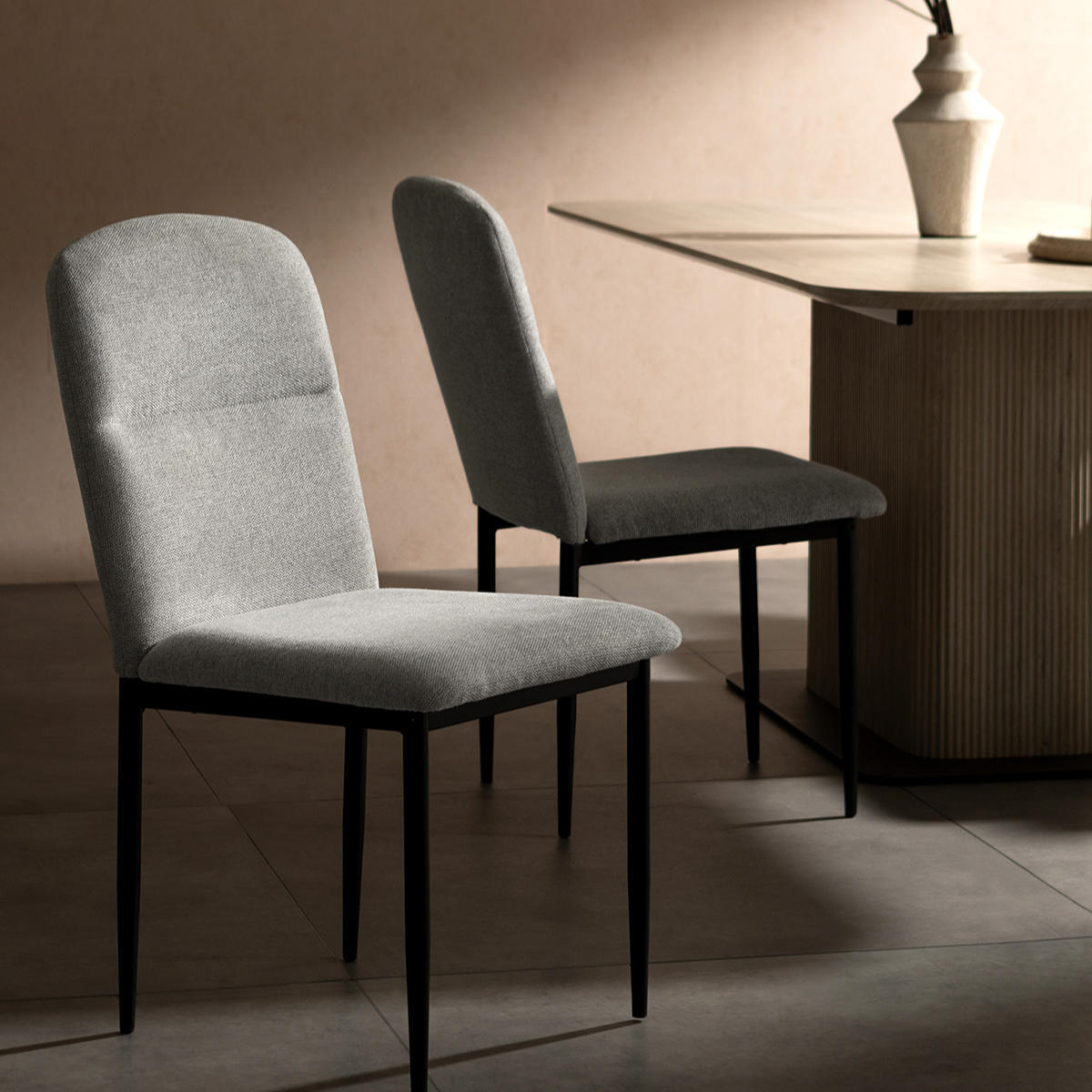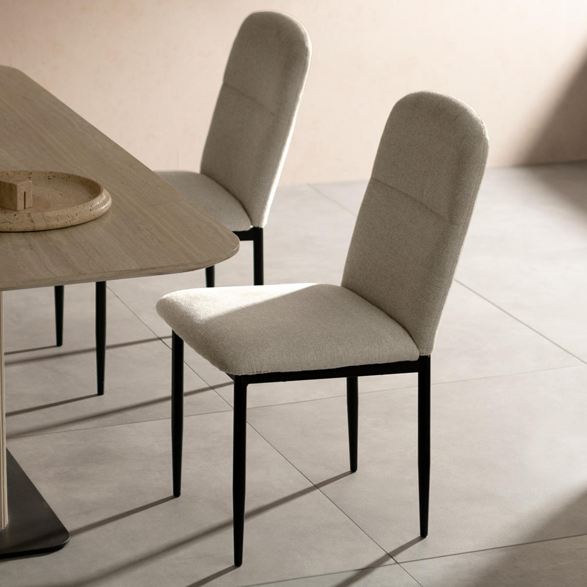 マットなブラックのスチール脚が全体を引き締め、モダンで洗練された印象に。先端に向かって細くなるスリムなデザインが、軽やかでスタイリッシュな佇まいを演出します。