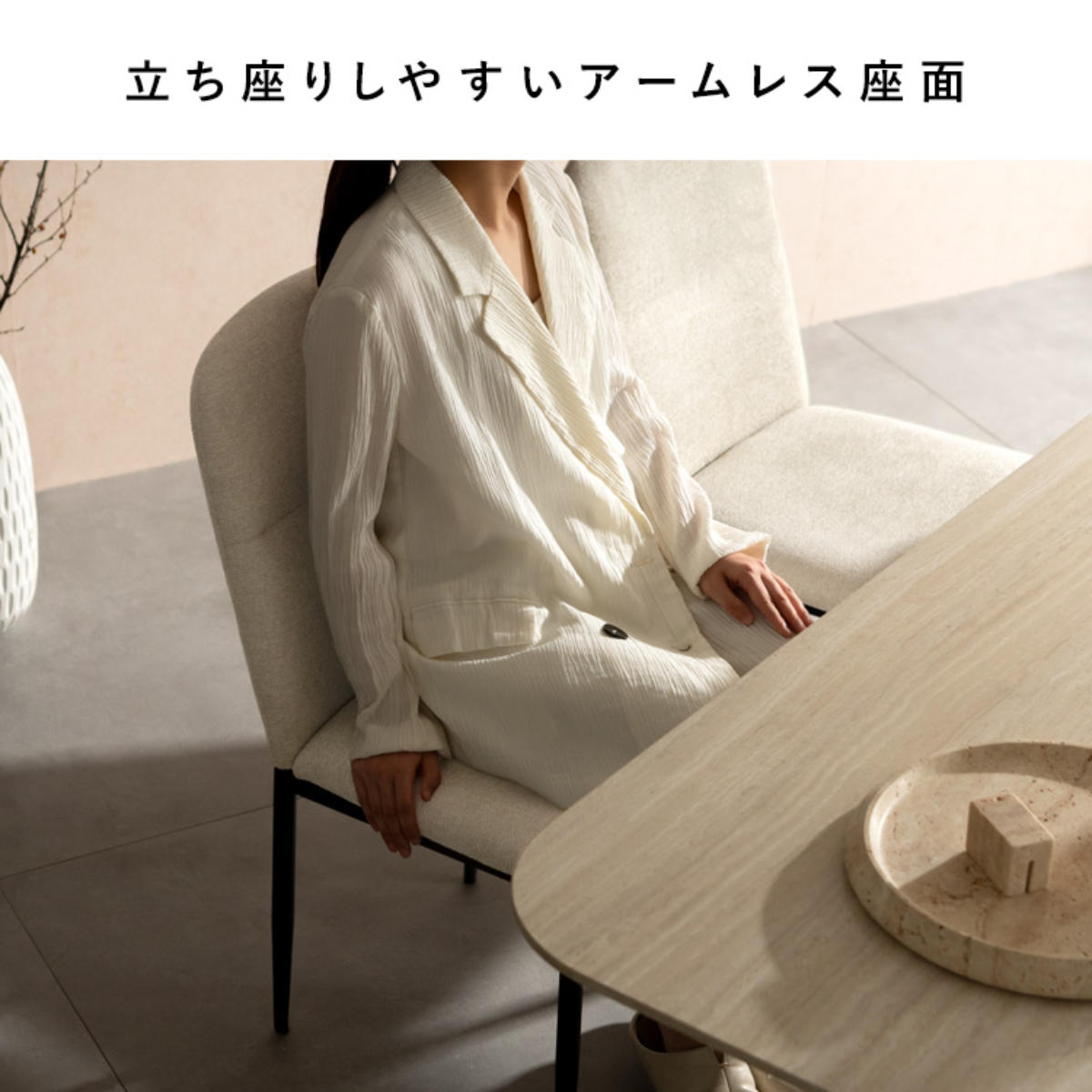 肘掛けのないアームレスタイプのため、立ち座りがスムーズ。テーブルへの出入りもしやすく、圧迫感のないすっきりとした印象です。