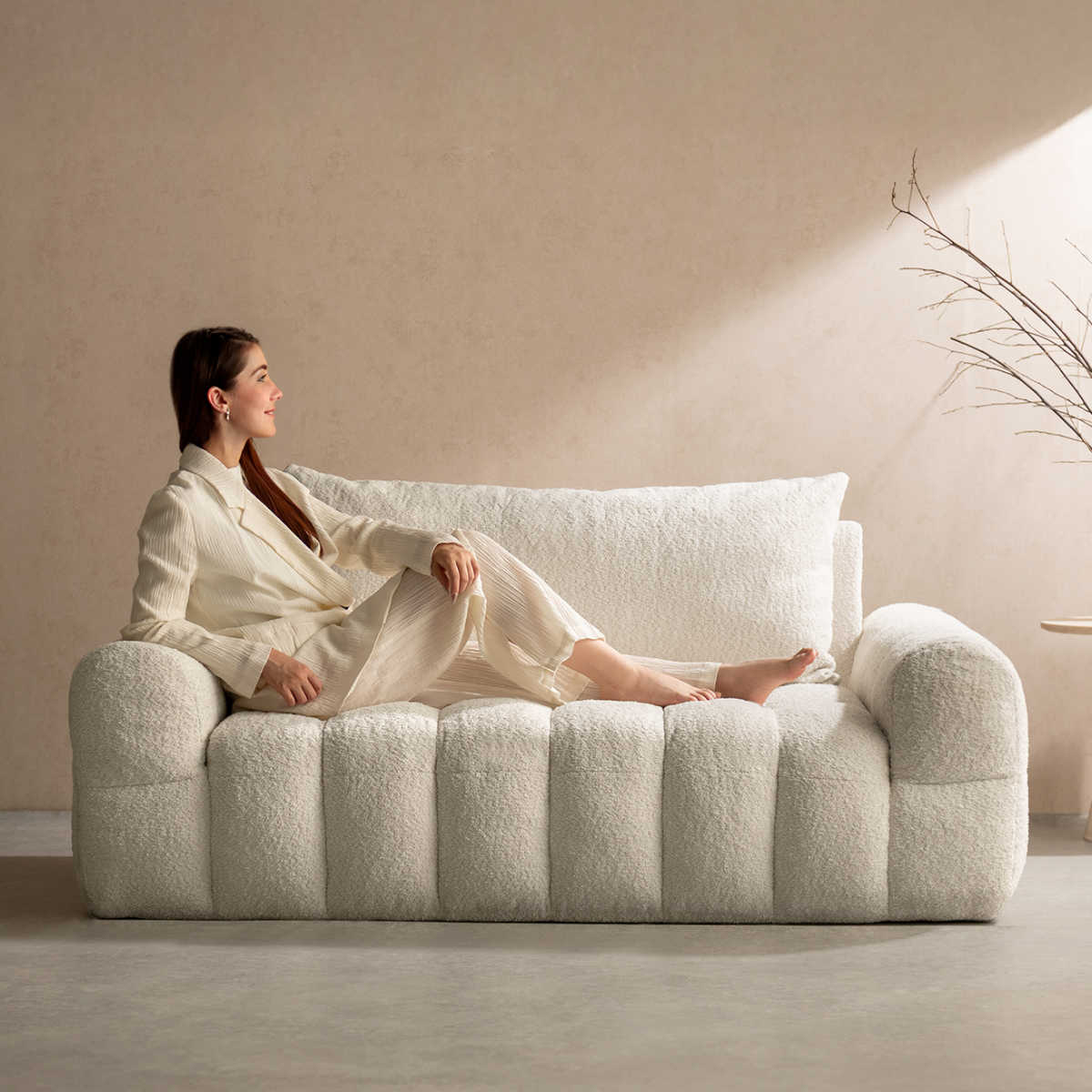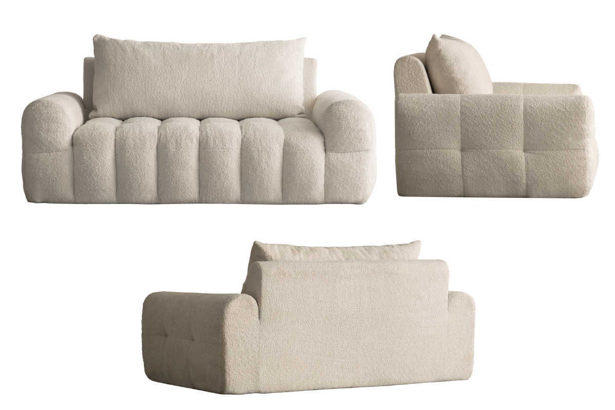 背面まで同じブークレ生地を使用した仕上がりで、どの角度から見ても美しいデザイン。お部屋の間仕切りとしてもお使いいただけます。
