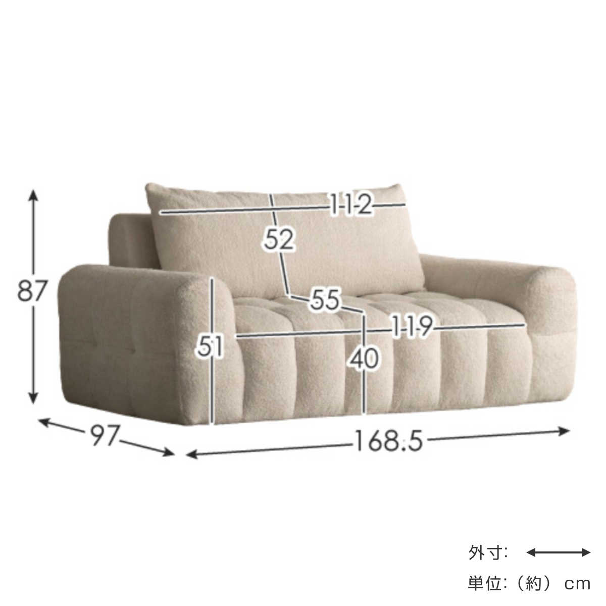 | サイズ | 約 幅168.5×奥行97×高さ87(cm) 座面高:約 40(cm) 座面サイズ:約 幅119×奥行55cm |