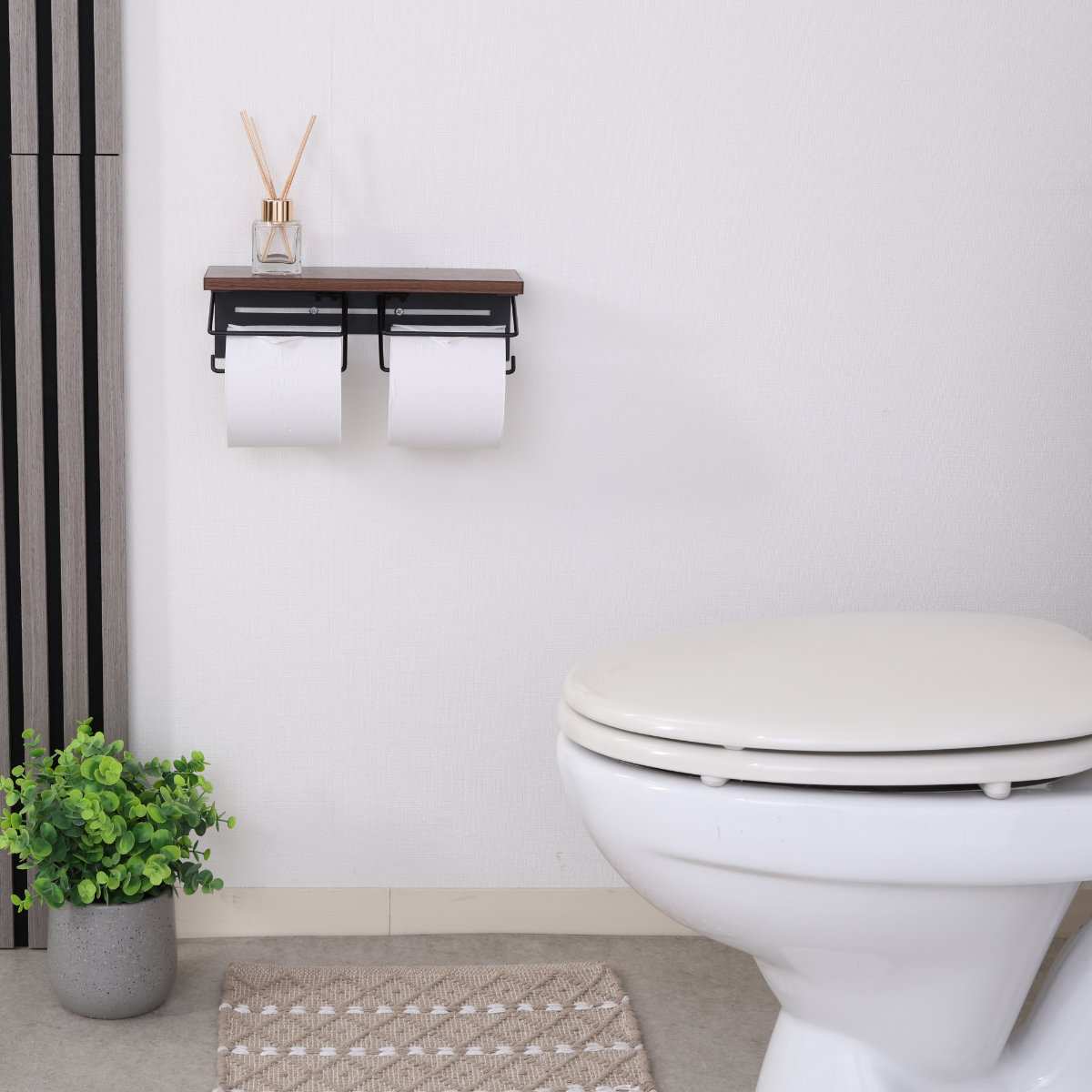 木のぬくもりを感じる木目天板と、無骨なワイヤーを組み合わせたトイレットペーパーホルダーです。ナチュラルさとヴィンテージ感を併せ持ち、トイレ空間におしゃれなアクセントを加えます。