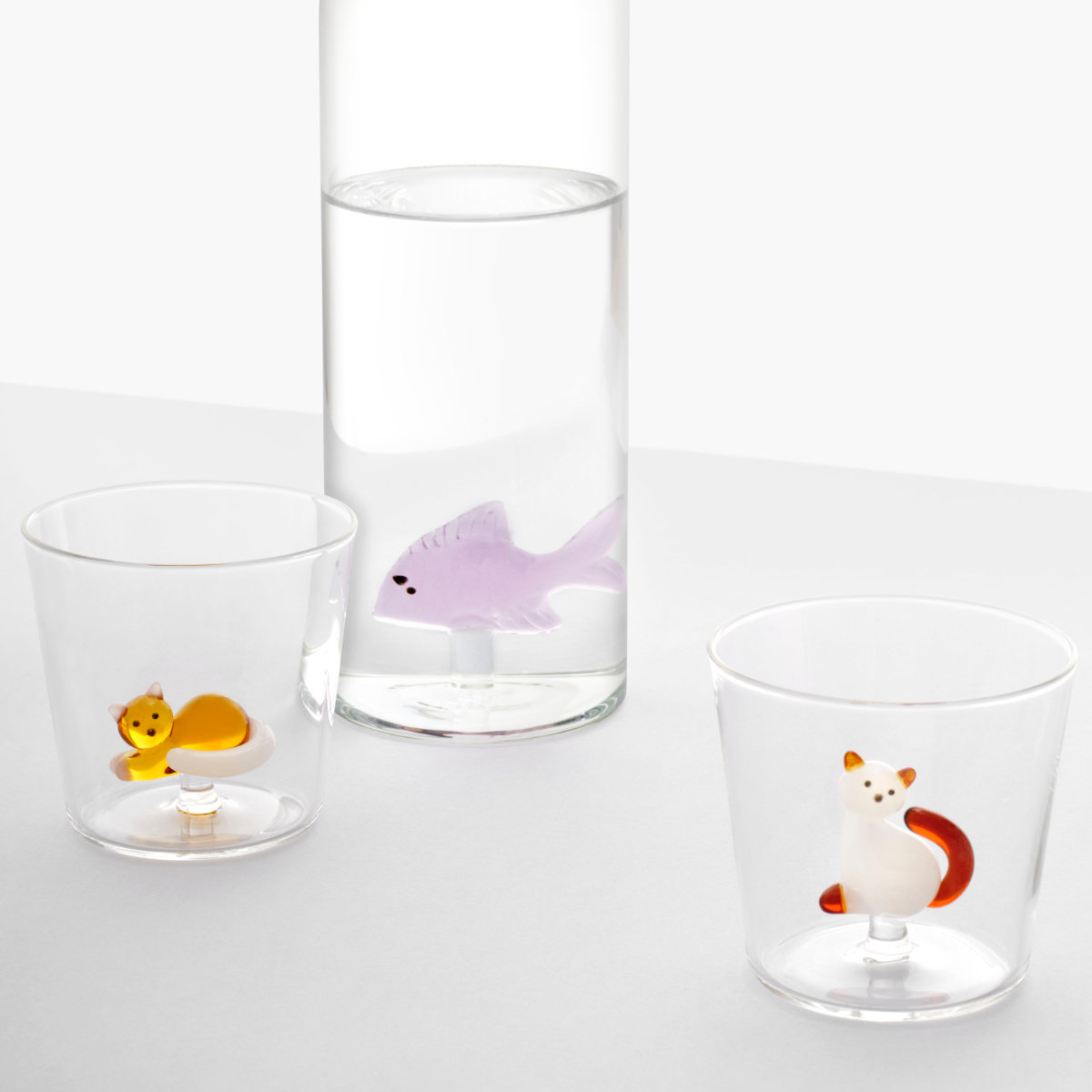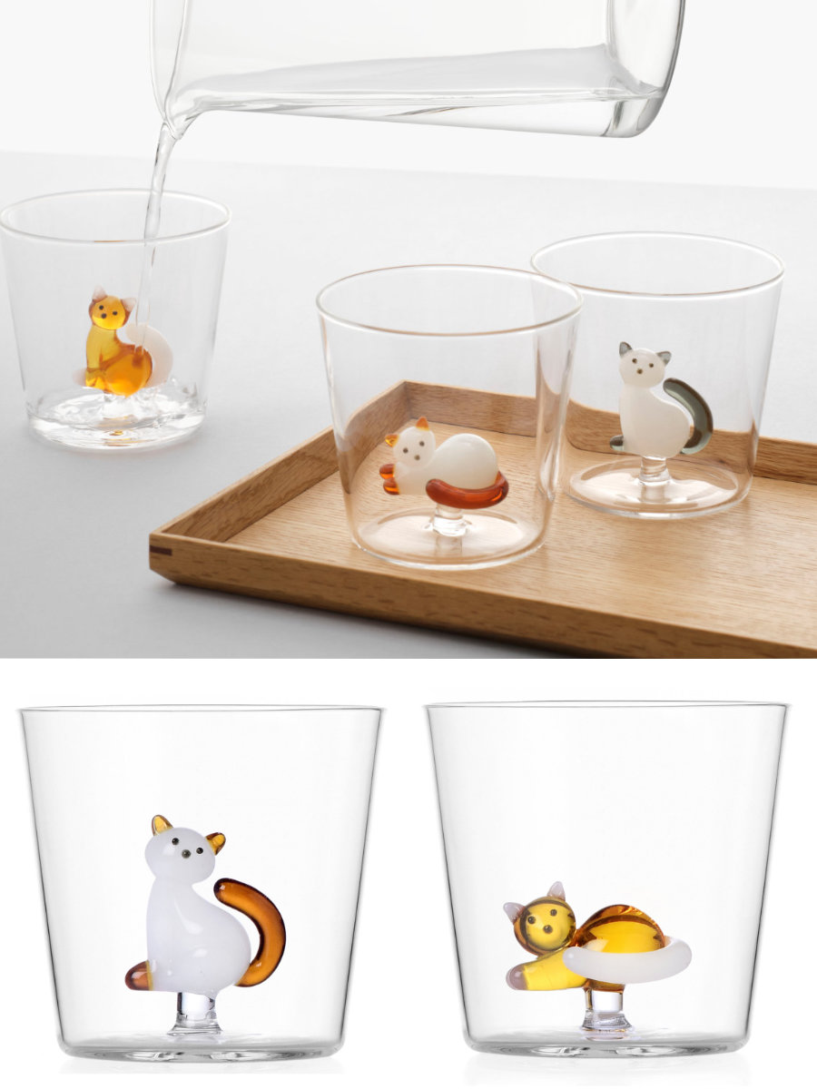 透明な耐熱ガラスの中に猫や魚などのモチーフを閉じ込めた、遊び心あふれるガラスウェアコレクションです。シンプルなフォルムの中にさりげなくあしらわれたモチーフが、日常のひとときを楽しく彩ります。