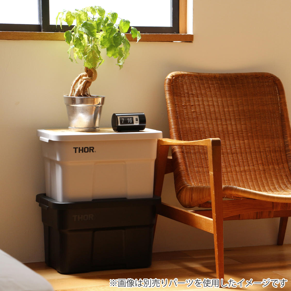 無骨で存在感のあるデザインが魅力のコンテナボックスです。アウトドアはもちろん、お部屋に置いても絵になる佇まいで、空間にアクセントを加えます。