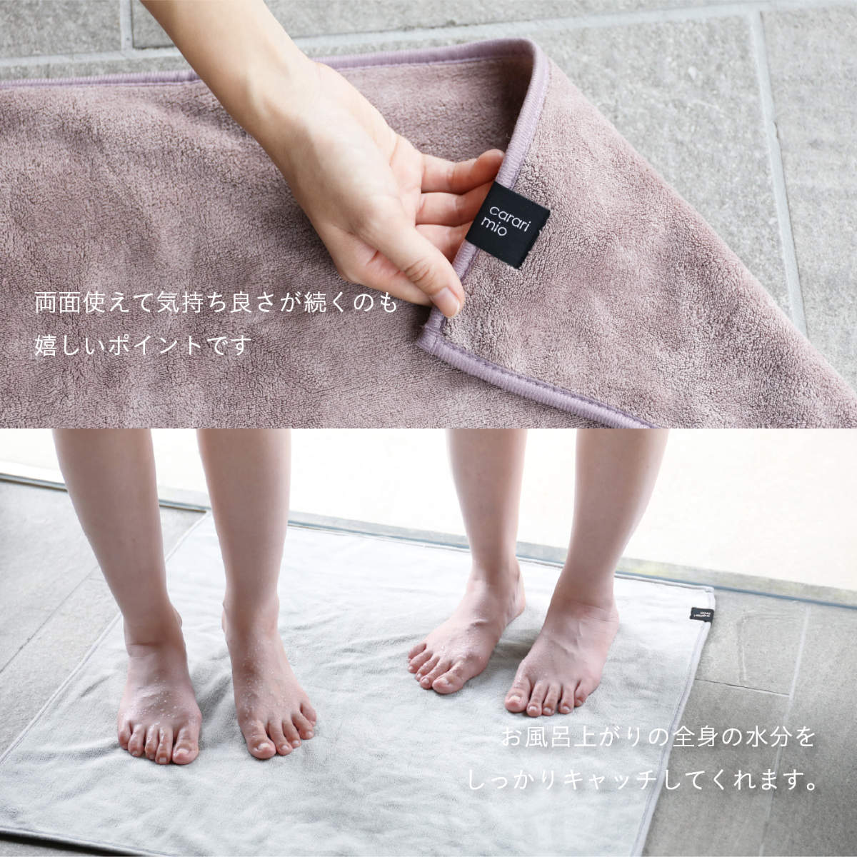 無数の極細マイクロファイバーが水分をすばやくキャッチします。お風呂上がりの足裏の水分もしっかり吸い取り、ベタつきを感じにくい快適な使い心地です。