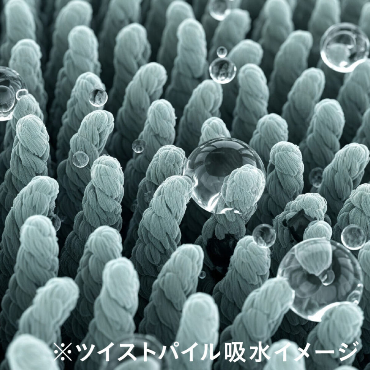 ツイストパイル状に加工したマイクロファイバーが、繊維1本1本の表面積を拡大しています。水滴を絡め取るように吸収する構造のため、拭き取った瞬間から高い吸水性を発揮し、60秒時点で綿タオルの約3倍の吸水力を実現します。