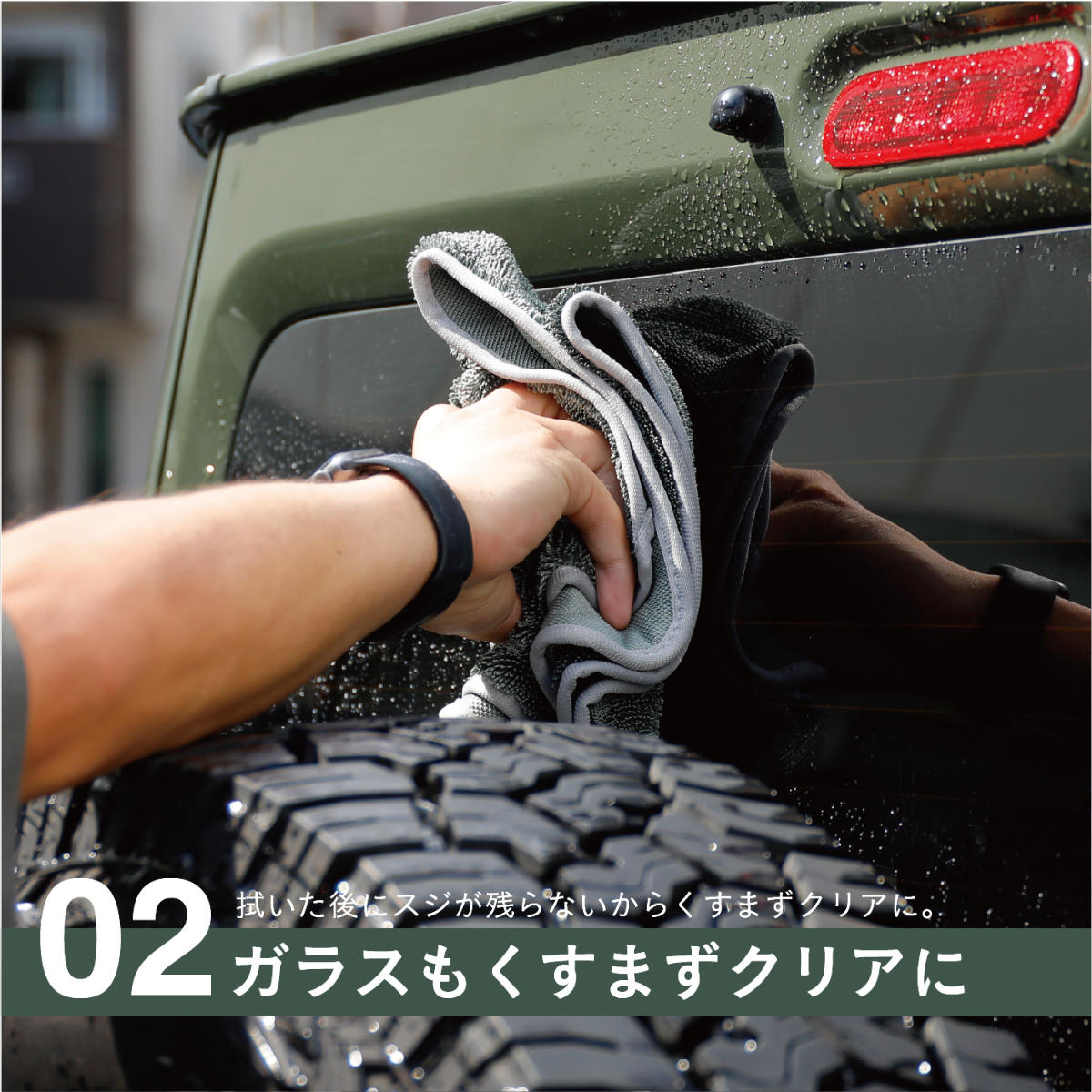繊維が細かく均一なマイクロファイバーを使用しています。繊維の乱れが少ないため、糸くずや毛羽立ちが発生しにくく、水分だけを効率よく吸収。ガラスやボディをくすませにくい拭き上げを実現します。