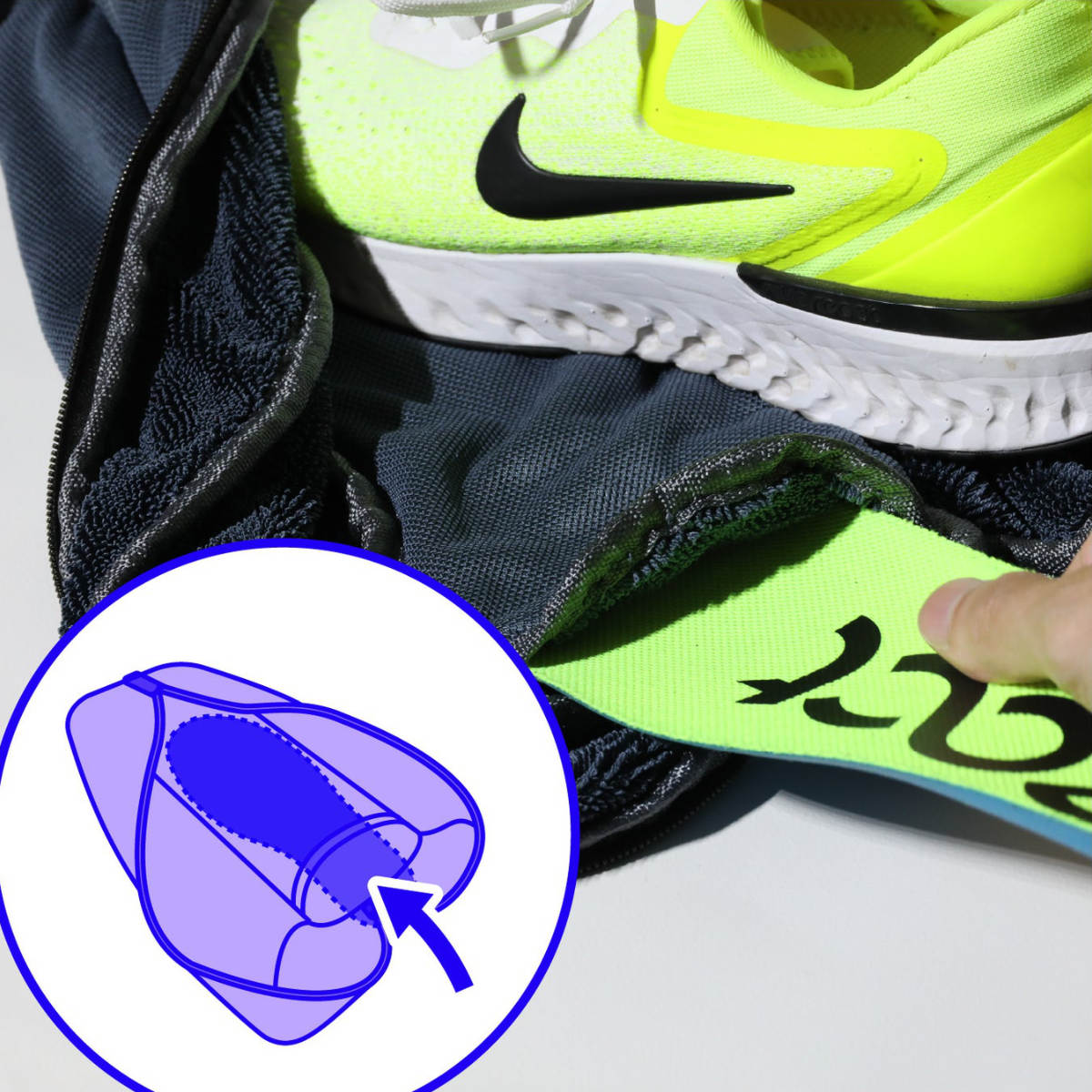 中敷きを靴本体と別で入れられる専用ポケットが付いています。洗濯中に絡まったり裏返ったりするのを防ぎ、靴本体を傷めずに中敷きを丁寧に洗うことができます。