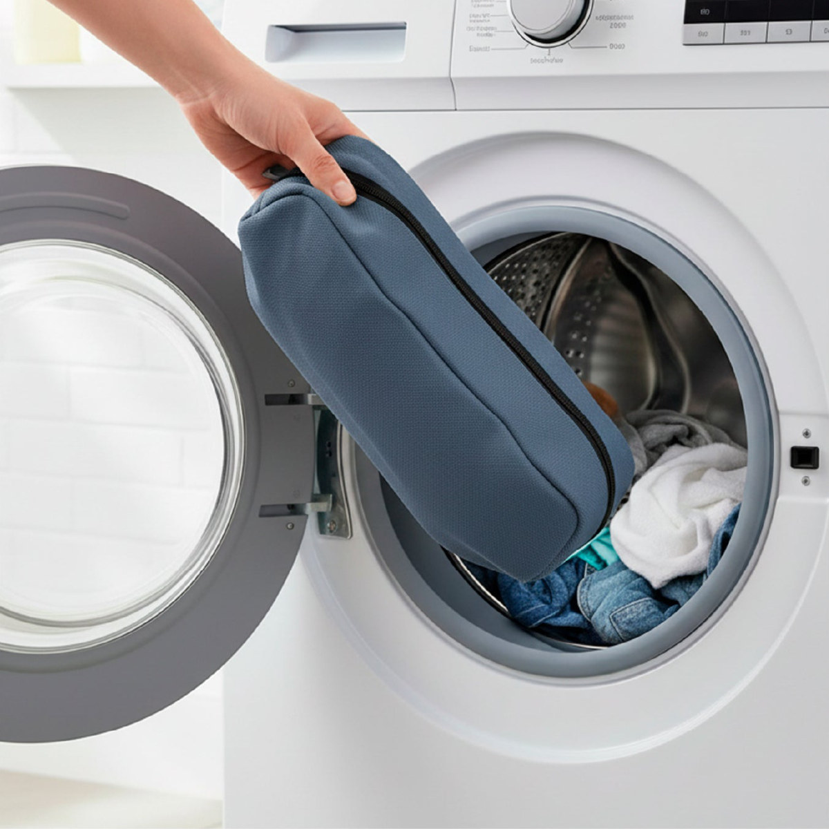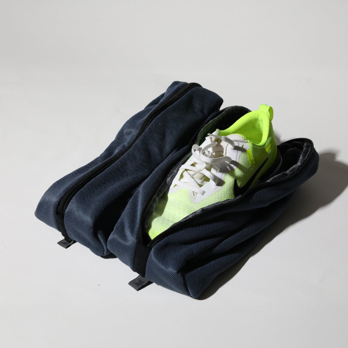 ファスナー開口部を大きく設計しているため、スニーカーや上履きも形を崩さずにスムーズに出し入れできます。入口が広いので、洗う前後のストレスが少なく、毎回ラクに使えます。