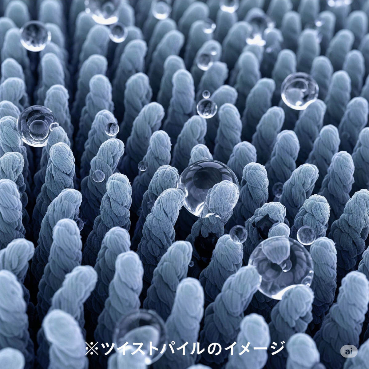 高密度ツイストパイルは、押しつぶされても元に戻りやすい復元性が特徴です。洗濯中の衝撃を吸収するクッション性が長持ちし、長期間使ってもへたりにくい素材です。