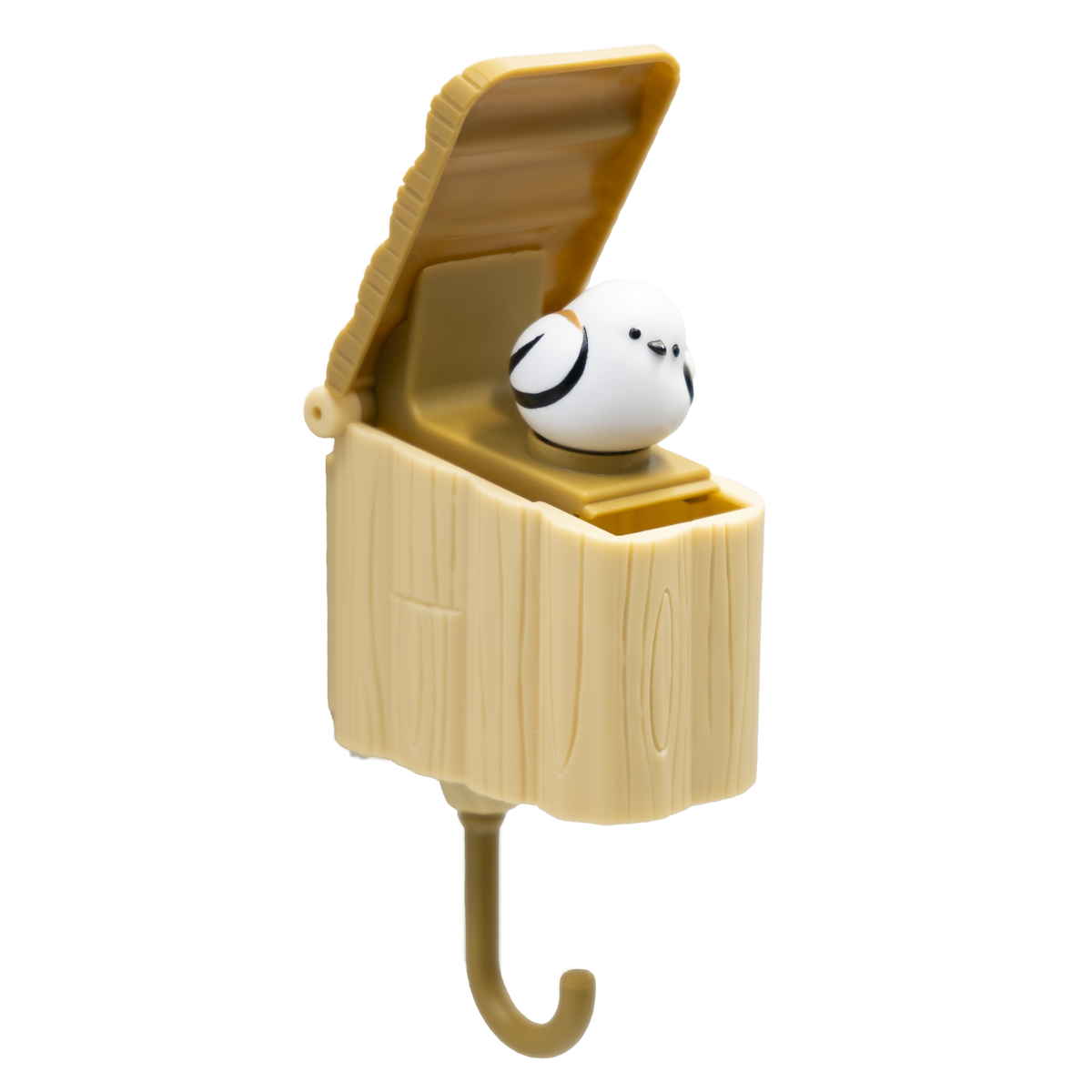 フックを軽く引くと、巣箱のフタがパカッと開き、中から小鳥がちょこんと顔を出すキーフックです。何気ない毎日の帰宅時間が、ちょっと楽しみになります。