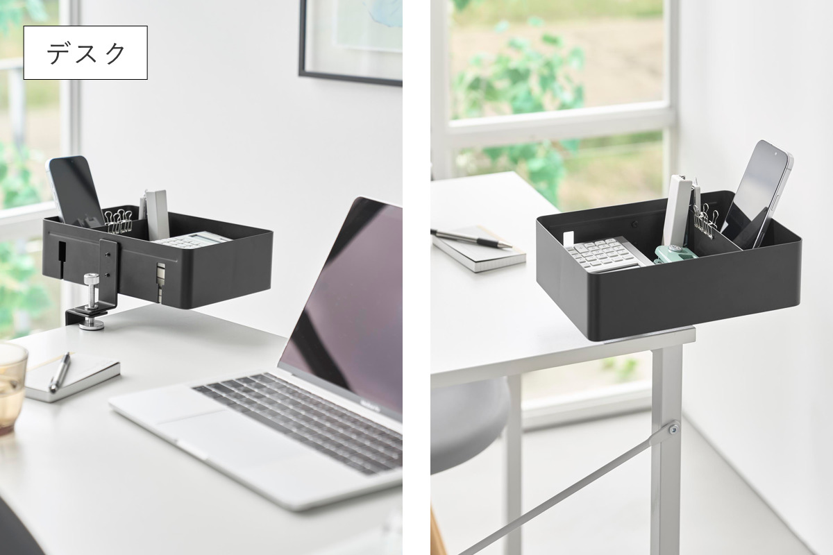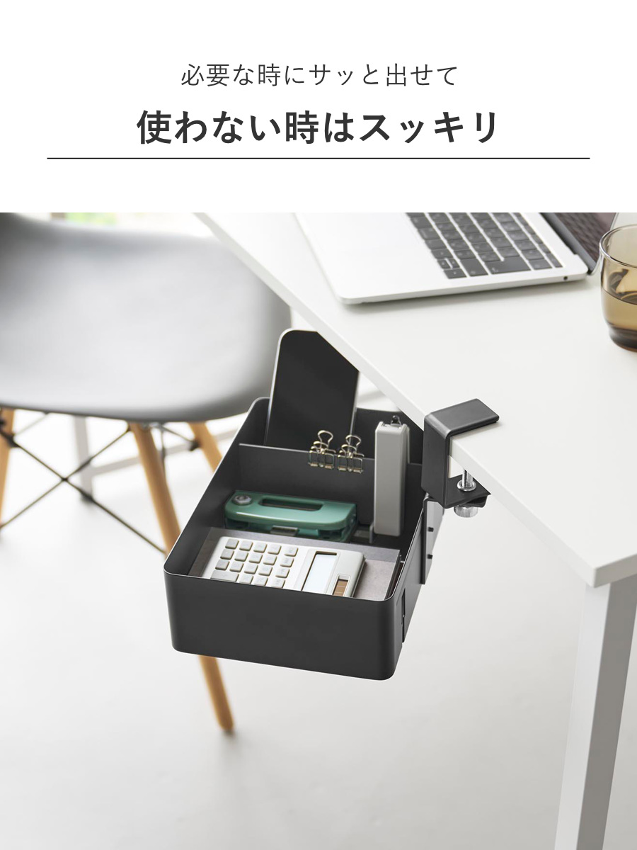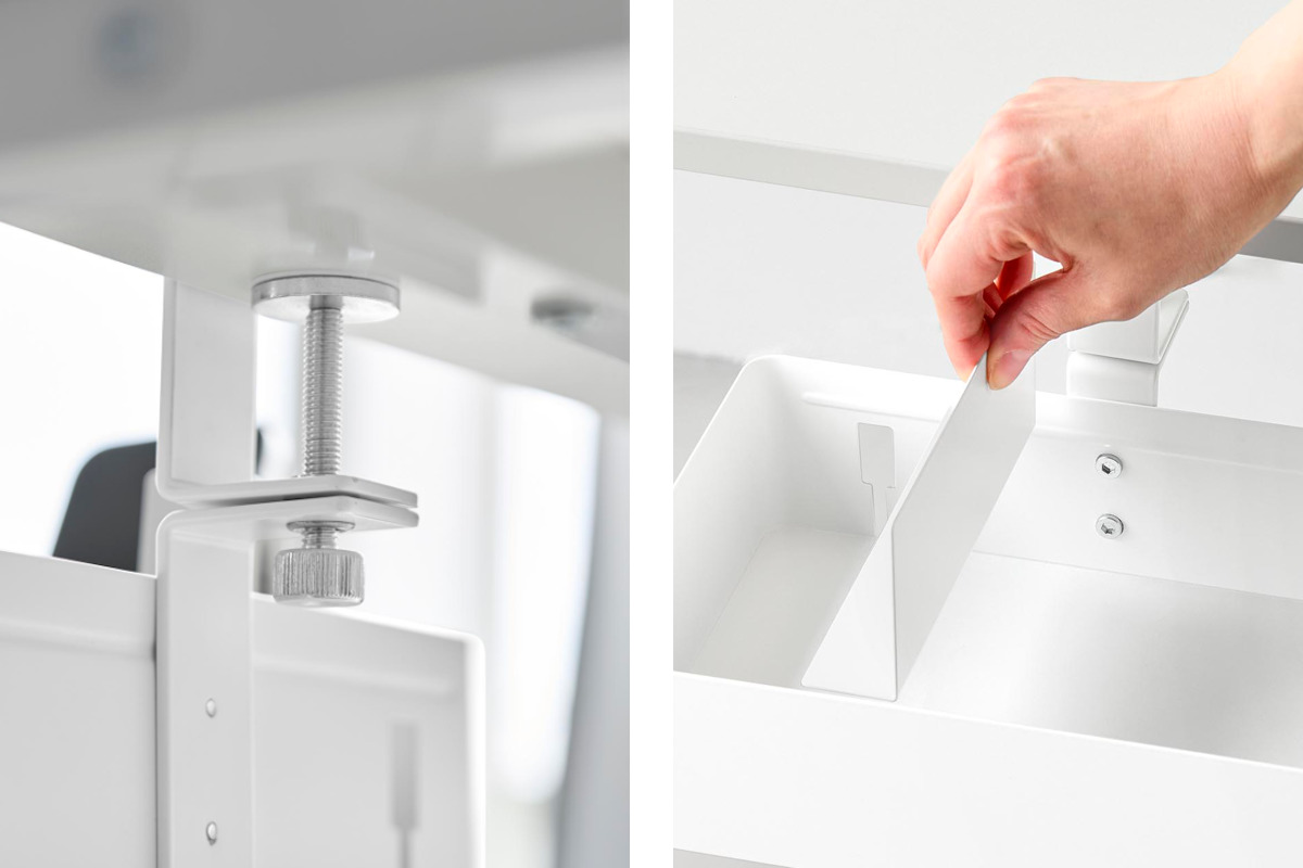クランプ式の固定構造でしっかりと設置できます。 | マグネット付きの仕切りは、収納物に合わせて自由に位置を調整できます。 |