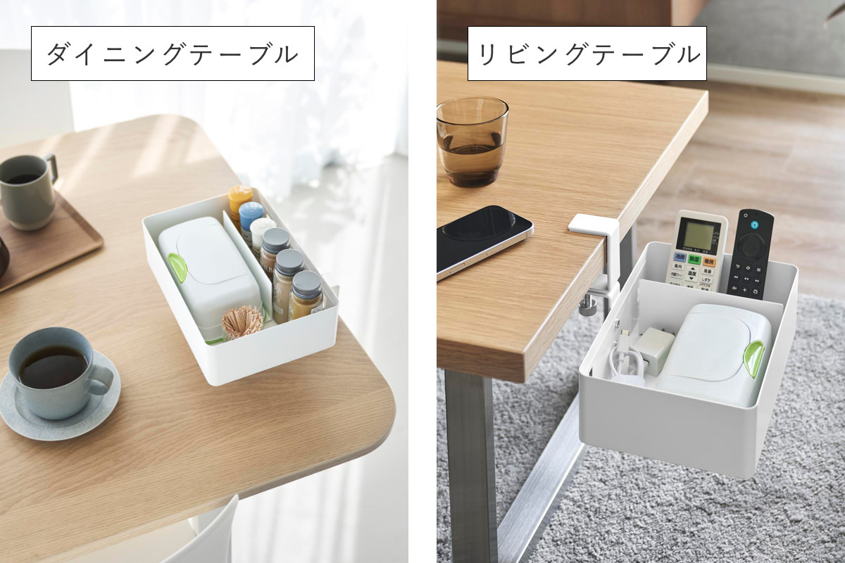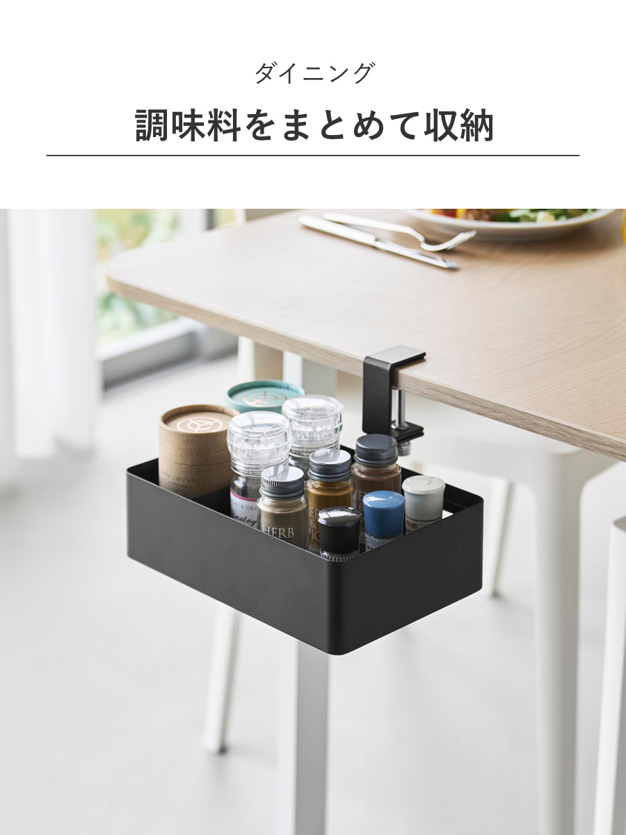 ダイニングテーブルに取り付けて、調味料をまとめて収納できます。ラックにまとめておくことで食事中にテーブルが広く使えて、使いたい時にキッチンまで取りに行く手間が省けて便利です。