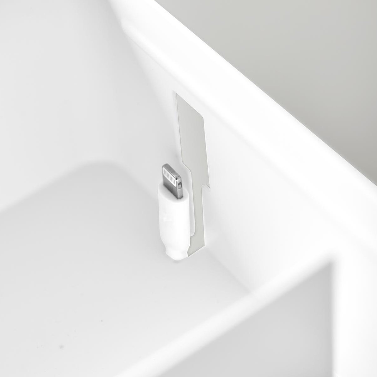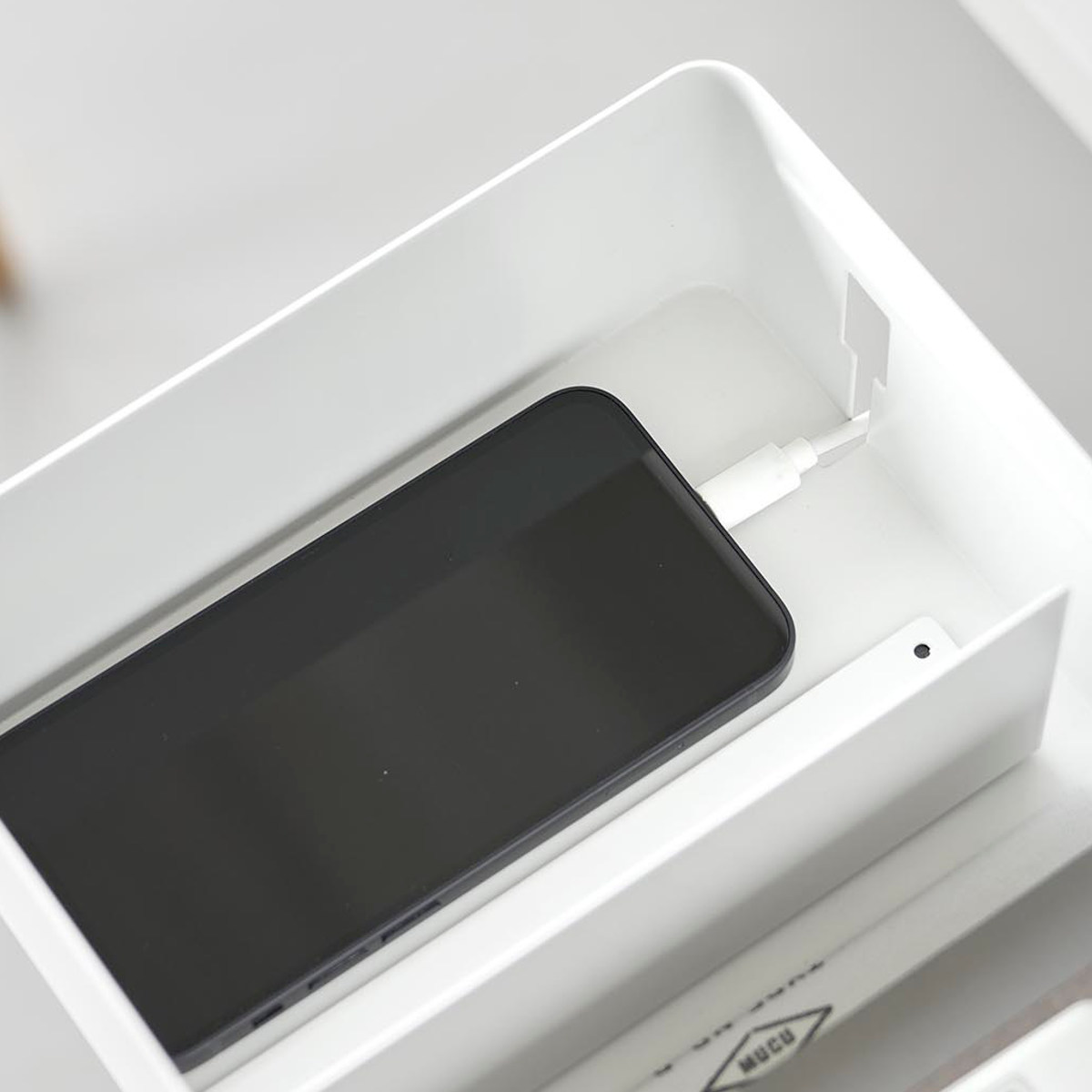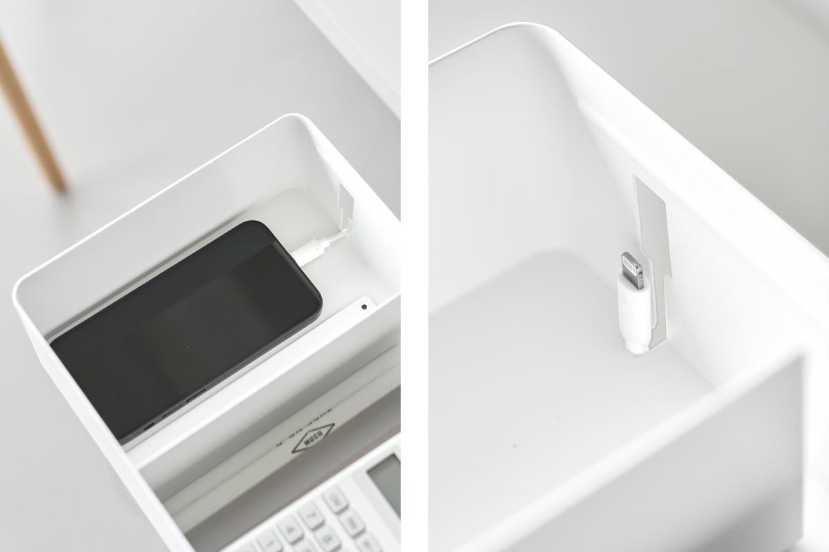 スマートフォンを収納しながら充電することも可能です。 | 充電しないときは、ケーブルの先端を引っ掛けておくことができます。 |