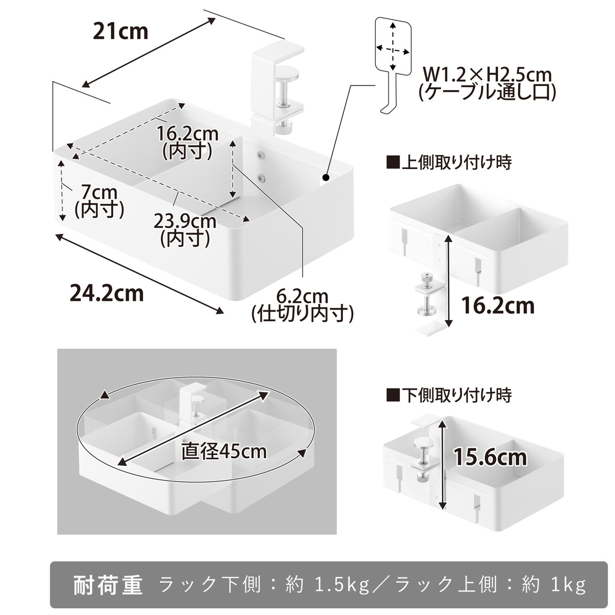 | サイズ | ラック(下側):約 幅24.2×奥行21×高さ15.6(cm) ラック(上側):約 幅24.2×奥行21×高さ16.2(cm) 収納部:約 幅23.9×奥行16.2×高さ7(cm) ケーブル通し口:約 幅1.2×高さ2.5(cm) 仕切り:約 高さ6.2(cm) |