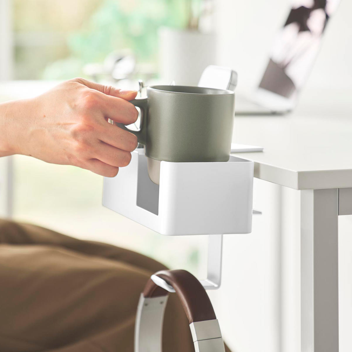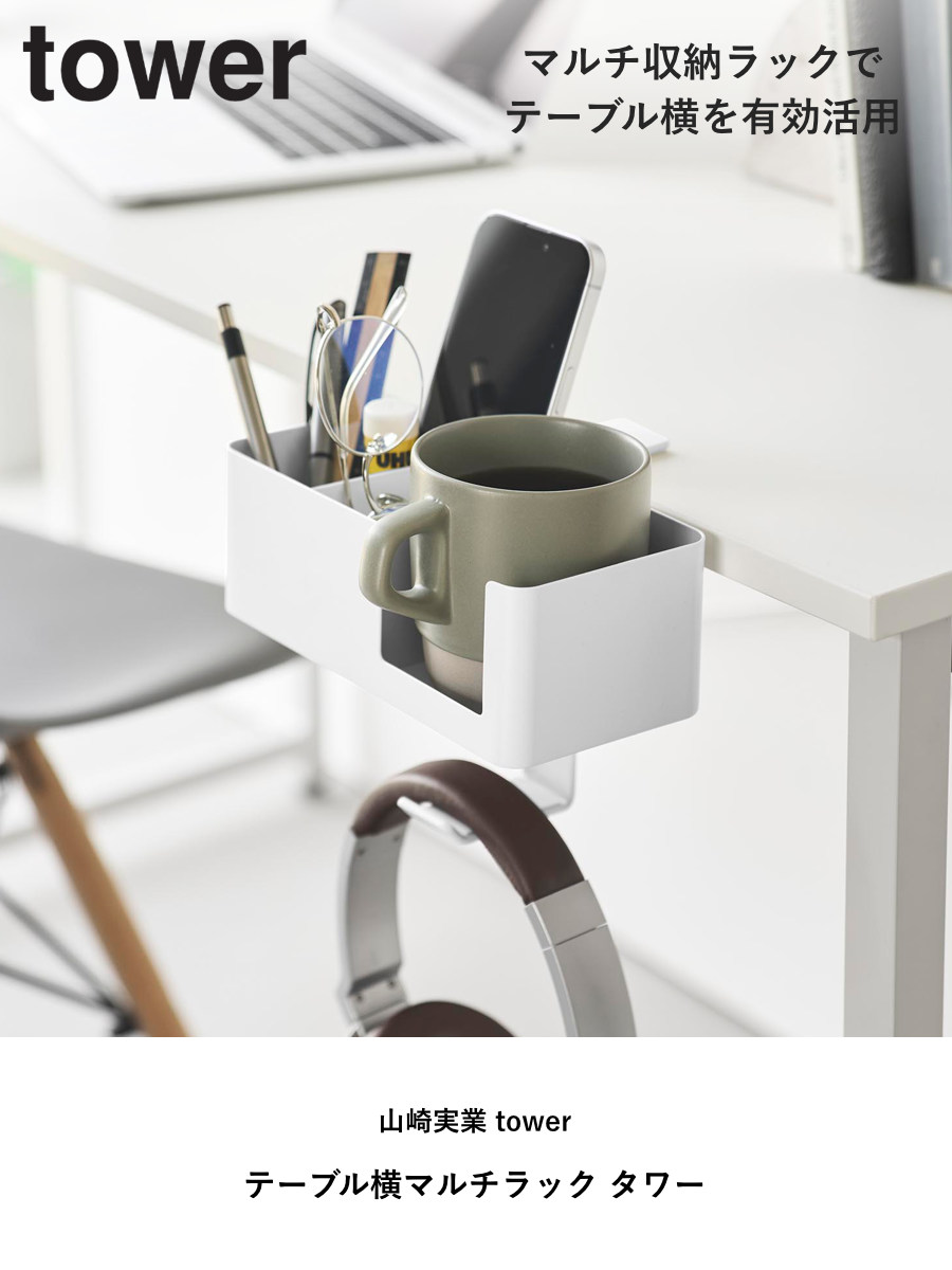 テーブル横に簡単に取り付けできる、便利な収納ラックです。作業に使う文房具など細かい物を手に取りやすい位置に収納できます。ハンドル付きのコップも安定して置けるデザインで、シリコーン製マットがキズや転倒を防ぎます。