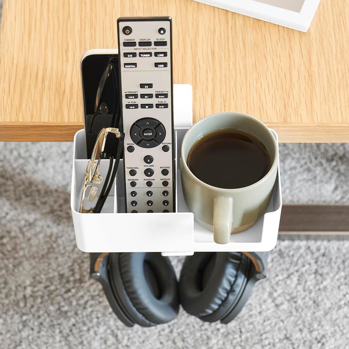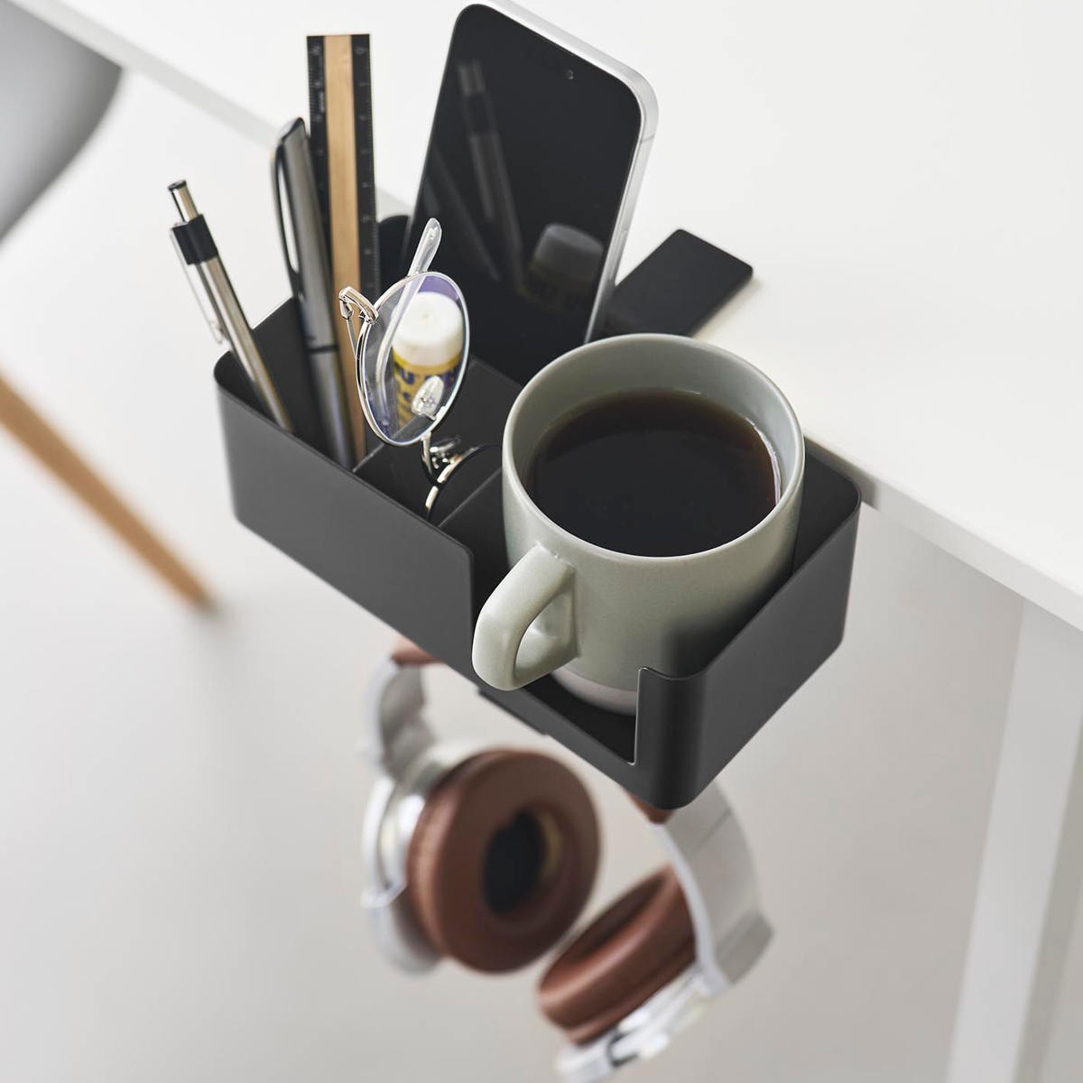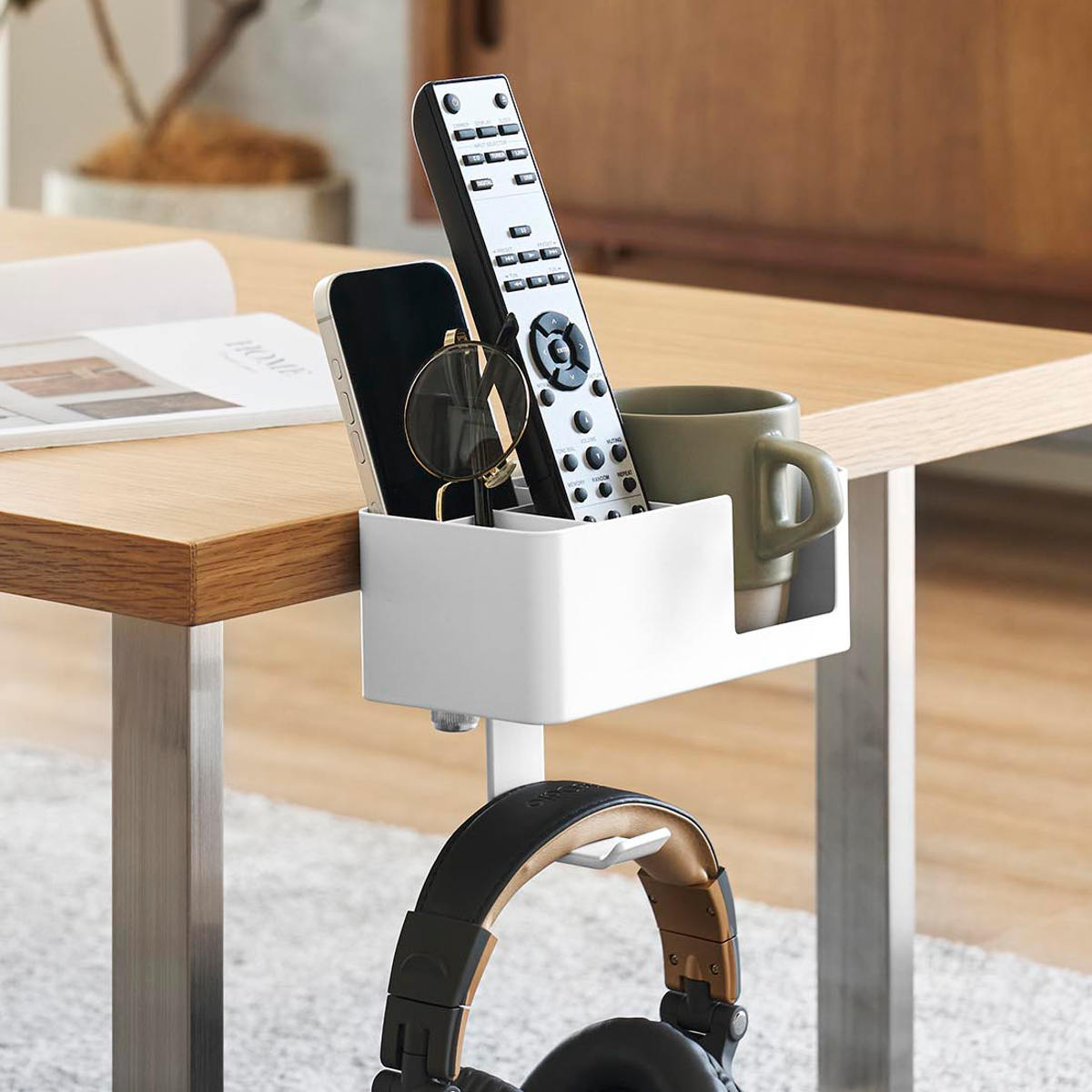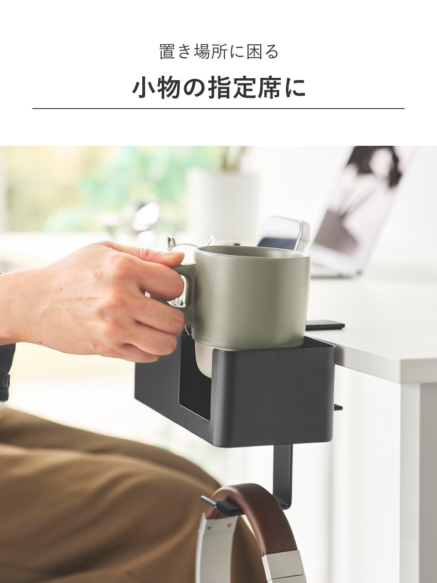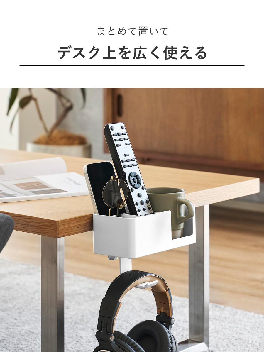 マグカップやスマートフォン、リモコン、メガネなど、置き場所に困る生活小物をまとめてスッキリ収納できます。デスク上を広く使えるので作業や食事も快適に。フックにはヘッドホンも掛けられます。