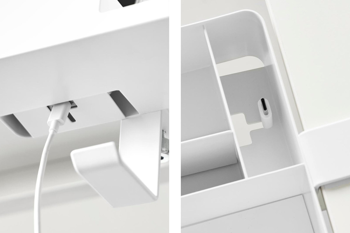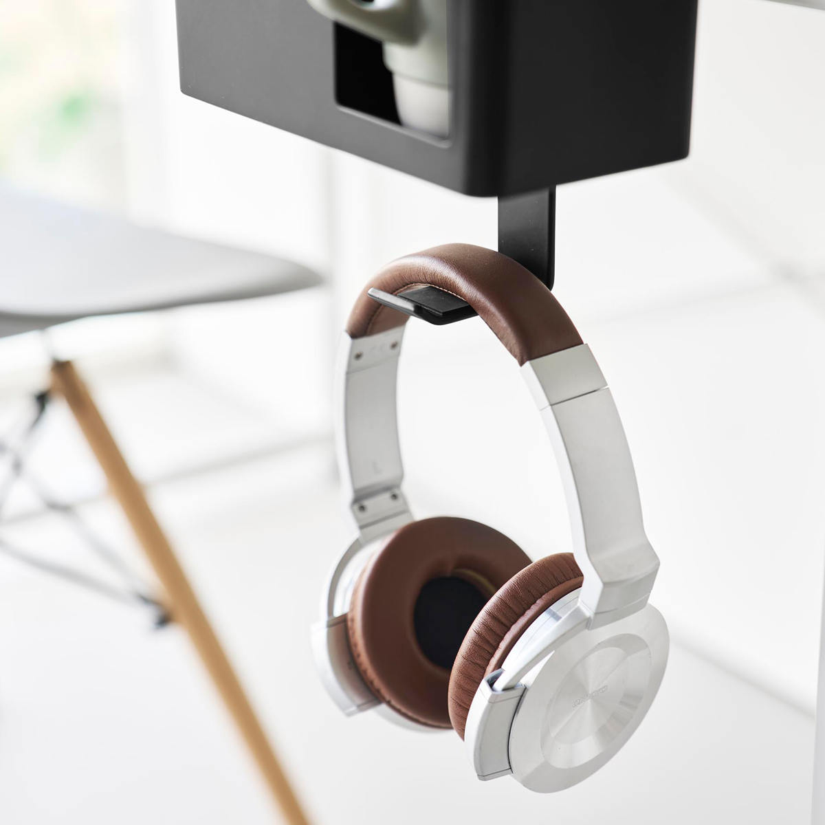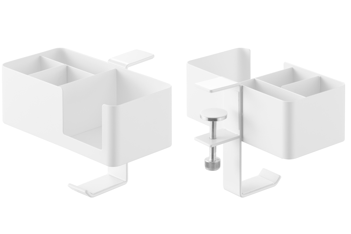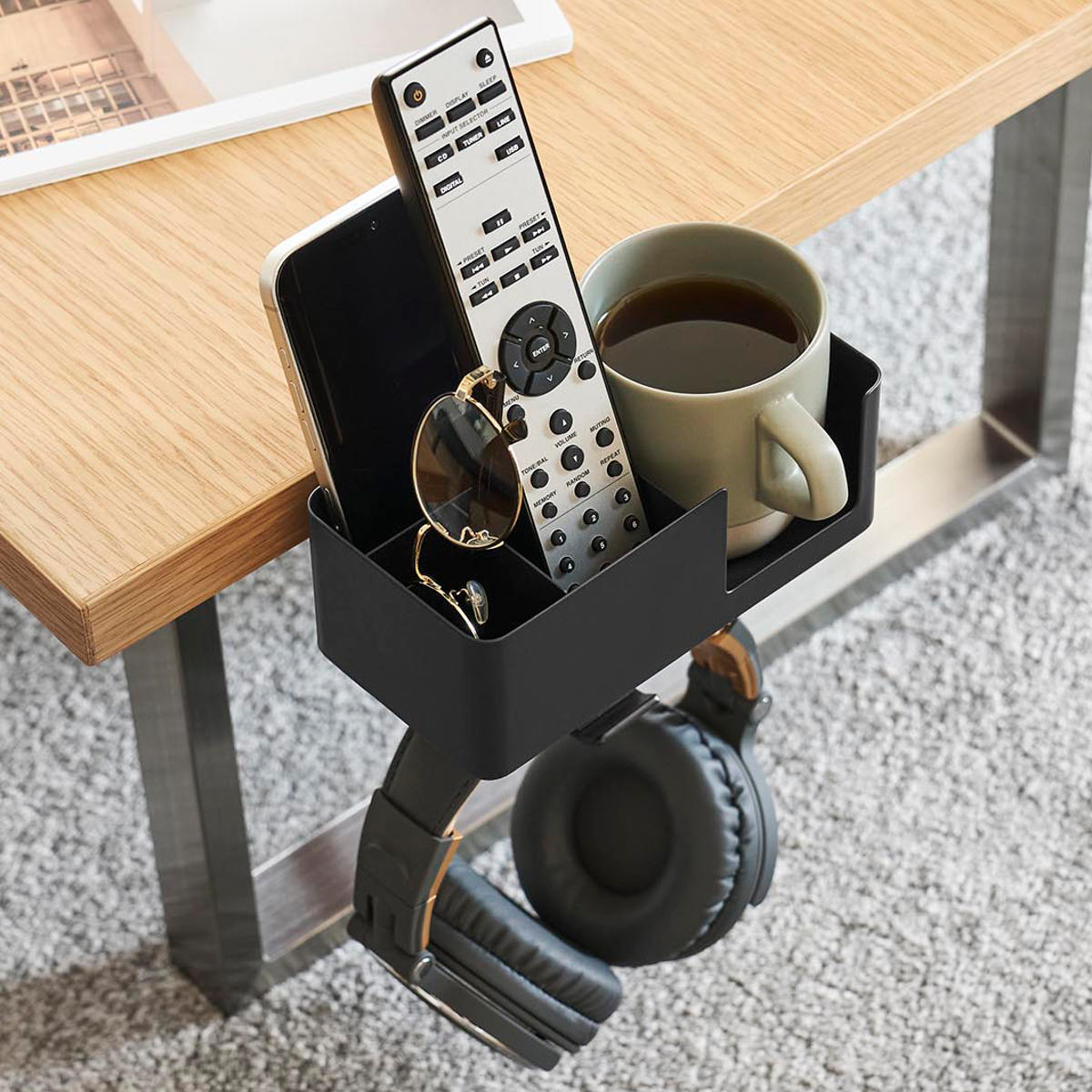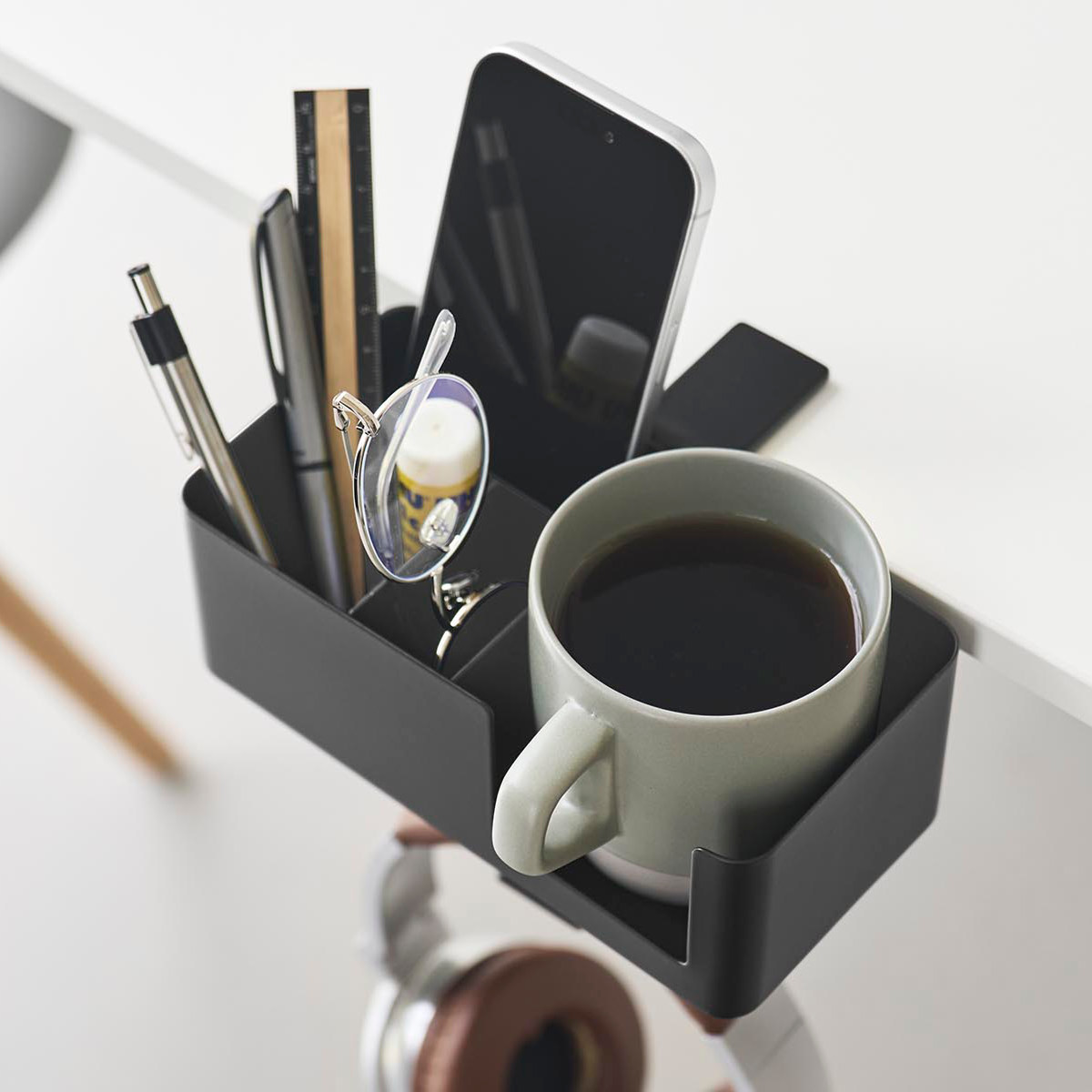 マグカップやスマートフォン、リモコン、メガネなど、置き場所に困る生活小物をまとめてスッキリ収納できます。デスク上を広く使えるので作業や食事も快適に。フックにはヘッドホンも掛けられます。