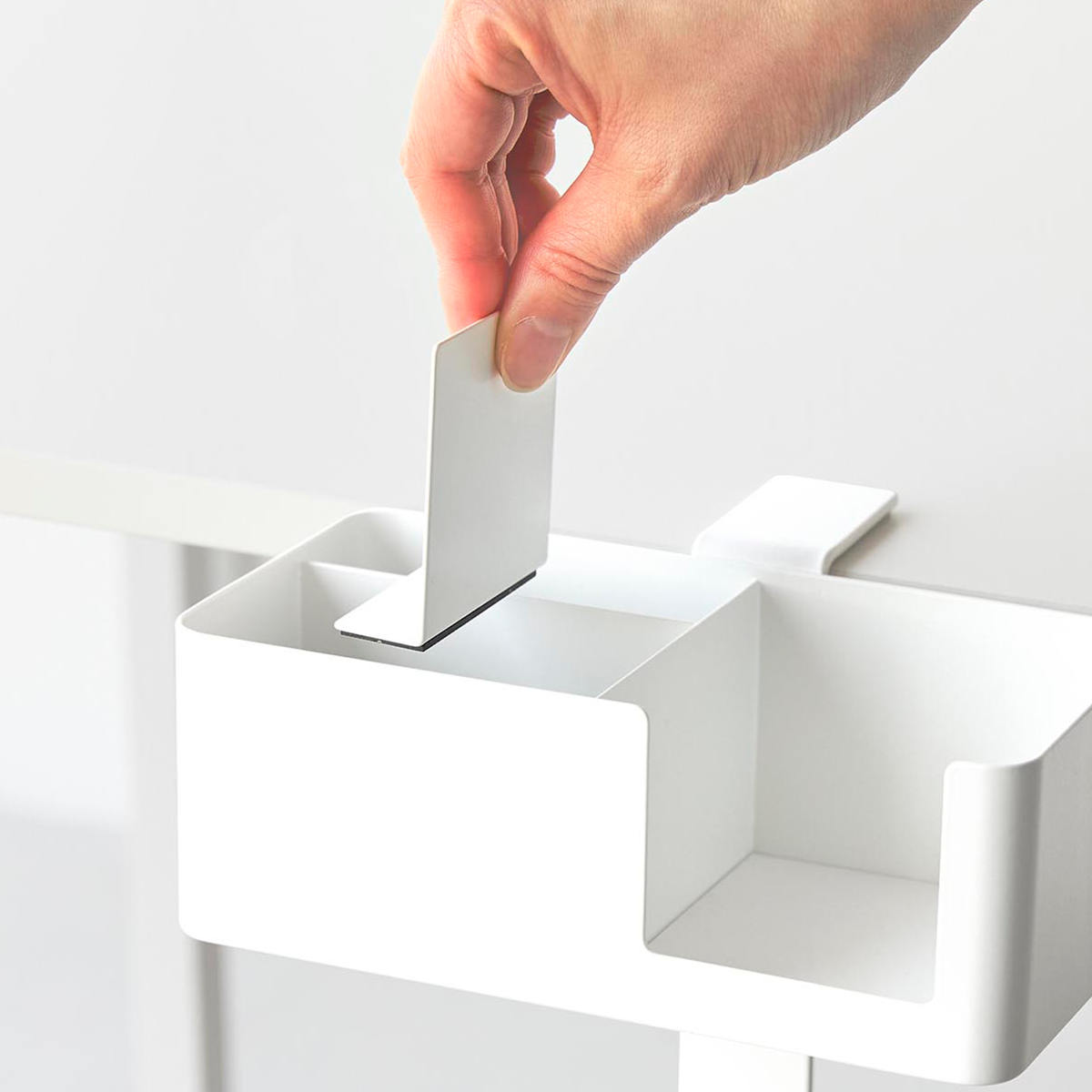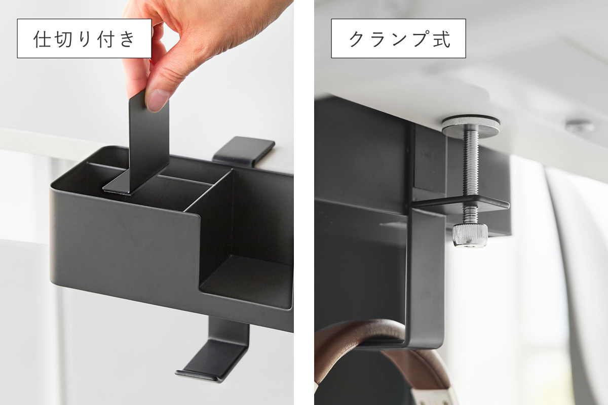 マグネット付きの仕切りは、収納物に合わせて自由に位置を調整できます。 | クランプ式の固定構造でしっかりと設置できます。 |