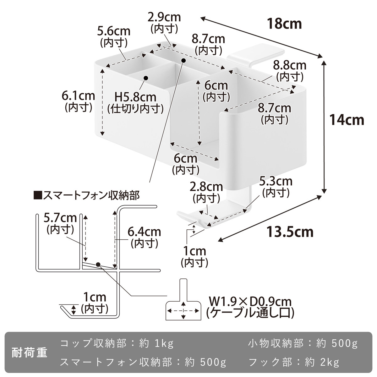 | サイズ | 約 幅18×奥行13.5×高さ14(cm) コップ収納部:約 幅8.8×奥行8.7×高さ6(cm) スマートフォン収納部:約 幅8.7×奥行2.9×高さ5.7~6.4(cm) ケーブル通し口:約 幅1.9×奥行0.9(cm) 小物収納部:約 幅8.7×奥行5.6×高さ6.1(cm) 仕切り:約 高さ5.8(cm) フック部:約 幅2.8×奥行5.3×高さ1(cm) |
