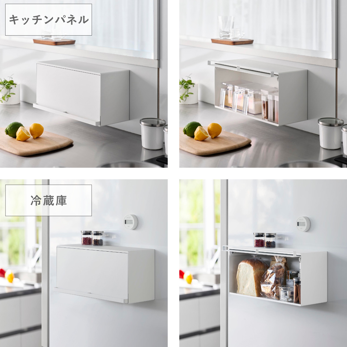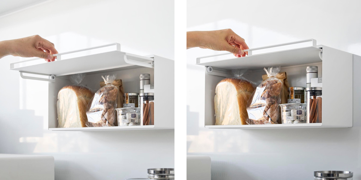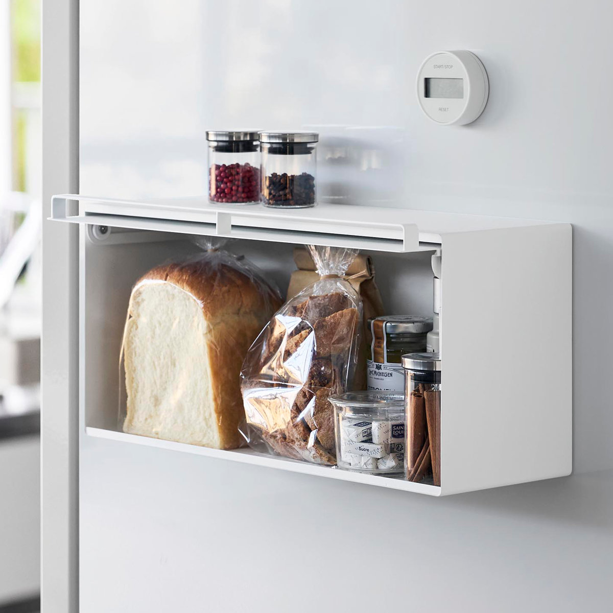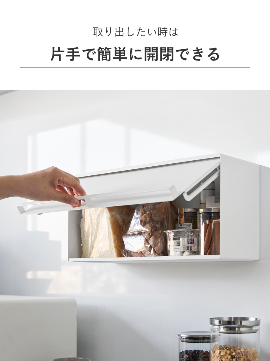 マグネットで簡単に設置できる浮かせて収納できるブレッドケースです。キッチンパネルや冷蔵庫など手の届きやすい場所に自由に設置できます。キッチンカウンターなどで雑然としがちなパンやジャム、コーヒーや紅茶などをすっきり収納できて、キッチン周りを広く使えます。