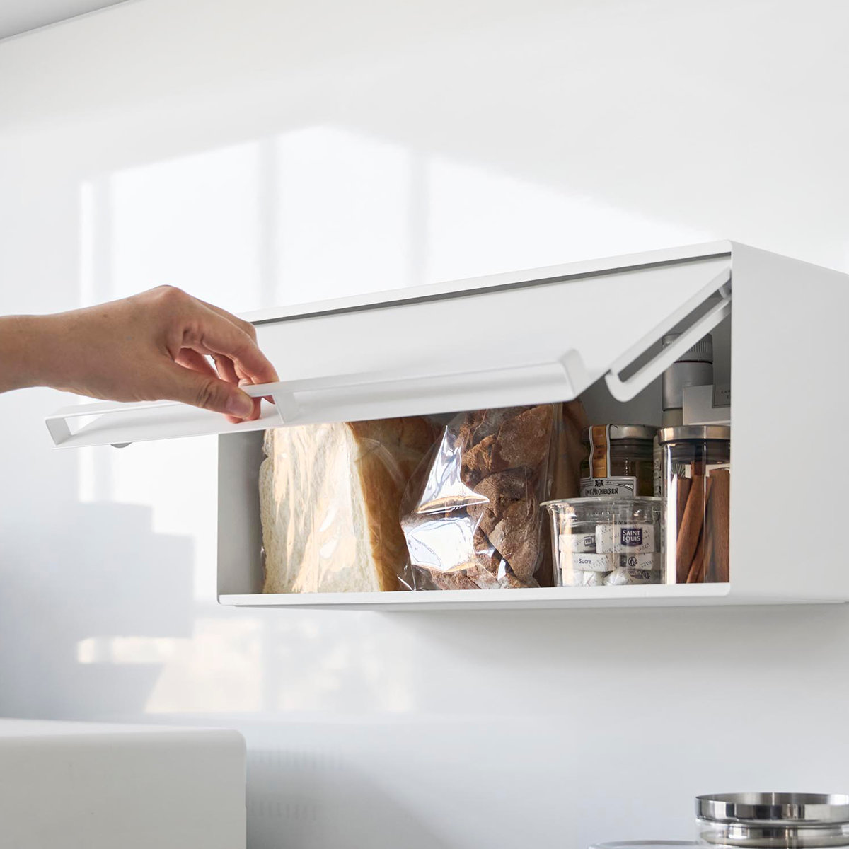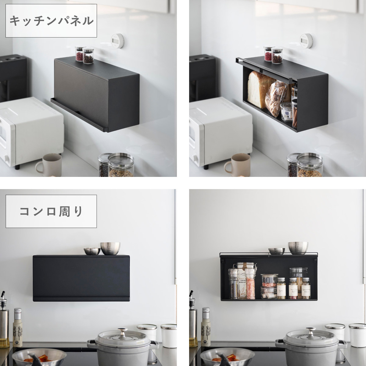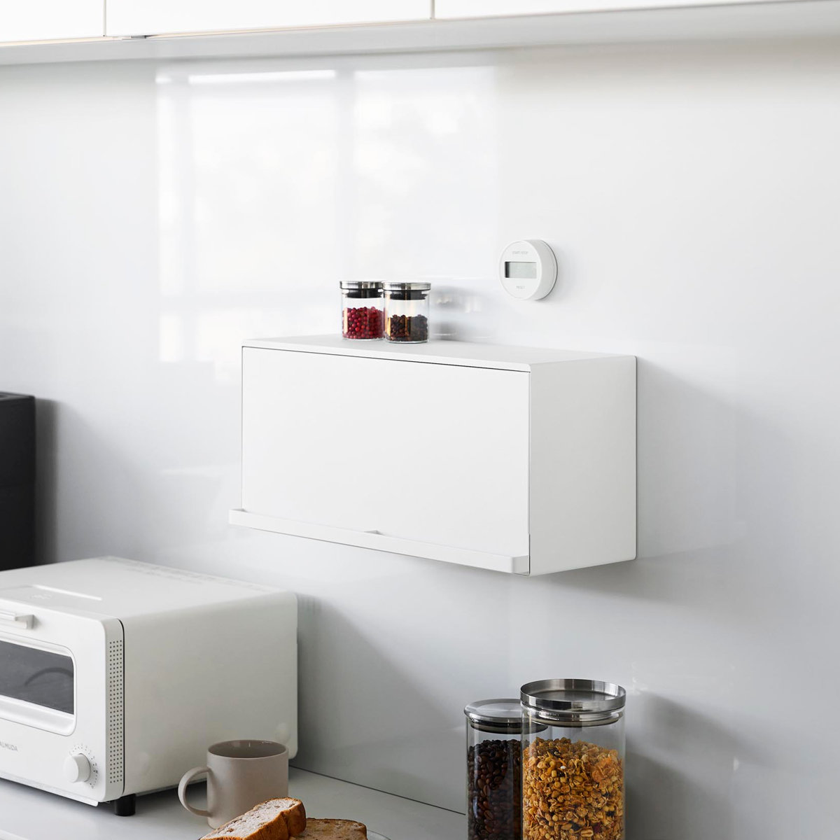 マグネットで簡単に設置できる浮かせて収納できるブレッドケースです。キッチンパネルや冷蔵庫など手の届きやすい場所に自由に設置できます。キッチンカウンターなどで雑然としがちなパンやジャム、コーヒーや紅茶などをすっきり収納できて、キッチン周りを広く使えます。