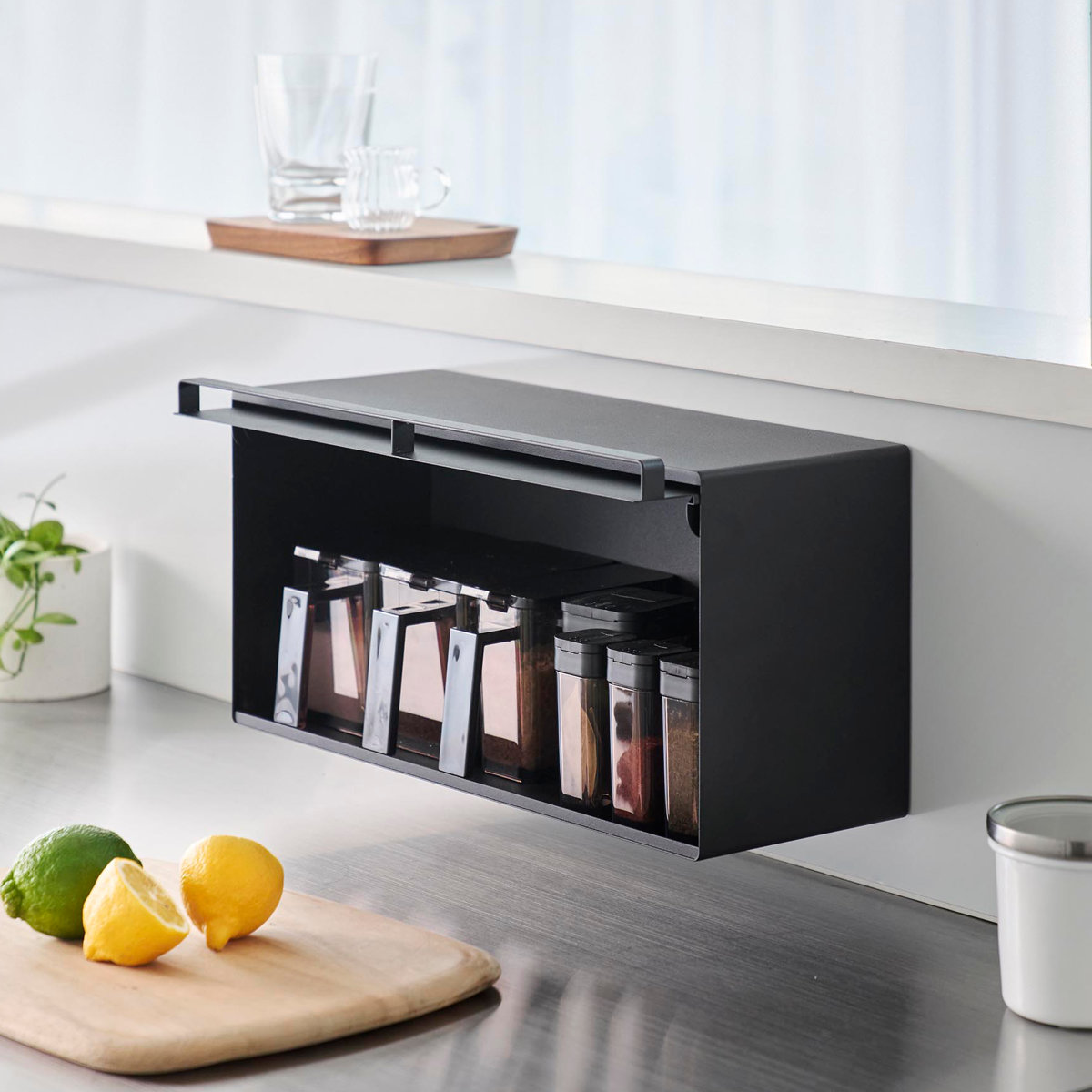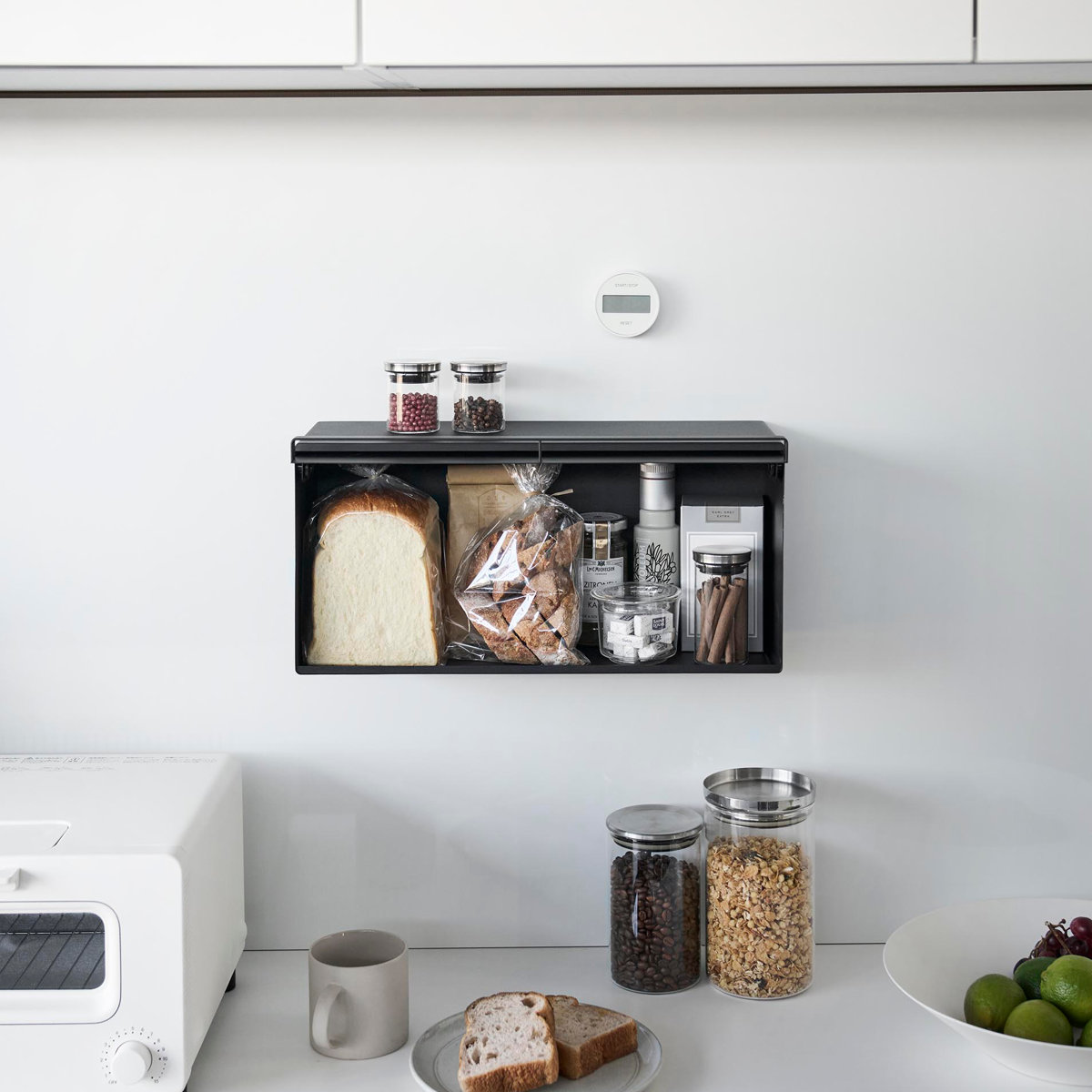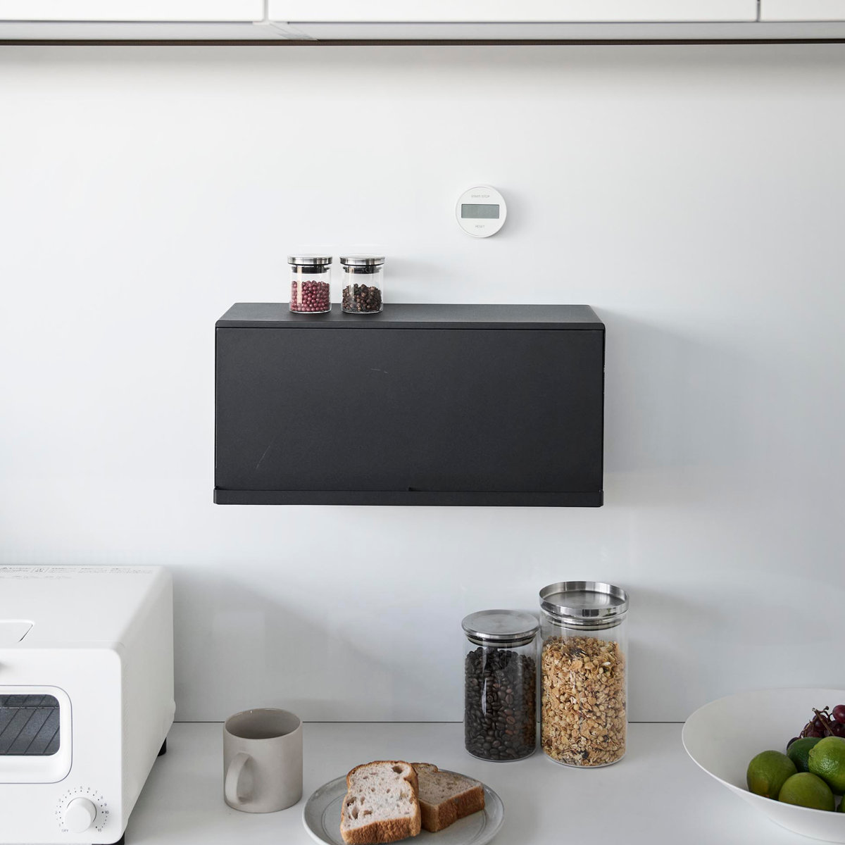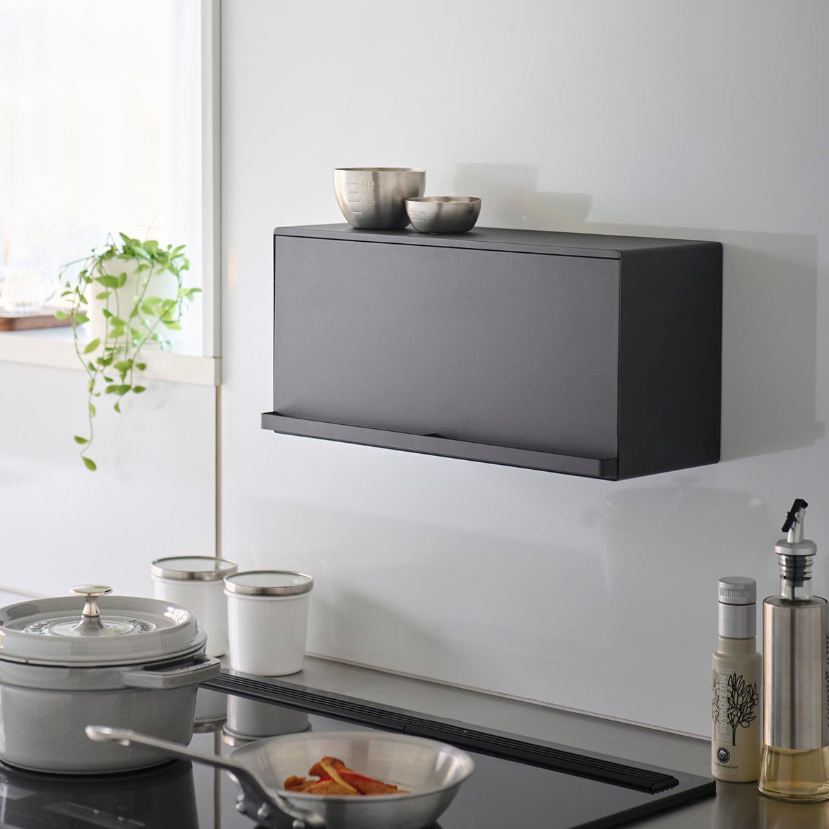 マグネットで簡単に設置できる浮かせて収納できるブレッドケースです。キッチンパネルや冷蔵庫など手の届きやすい場所に自由に設置できます。キッチンカウンターなどで雑然としがちなパンやジャム、コーヒーや紅茶などをすっきり収納できて、キッチン周りを広く使えます。