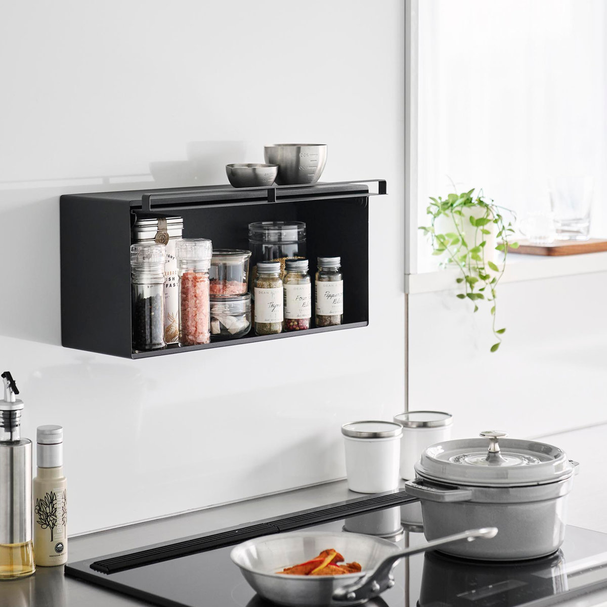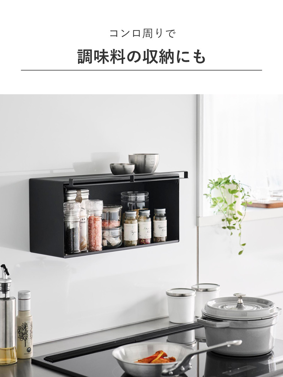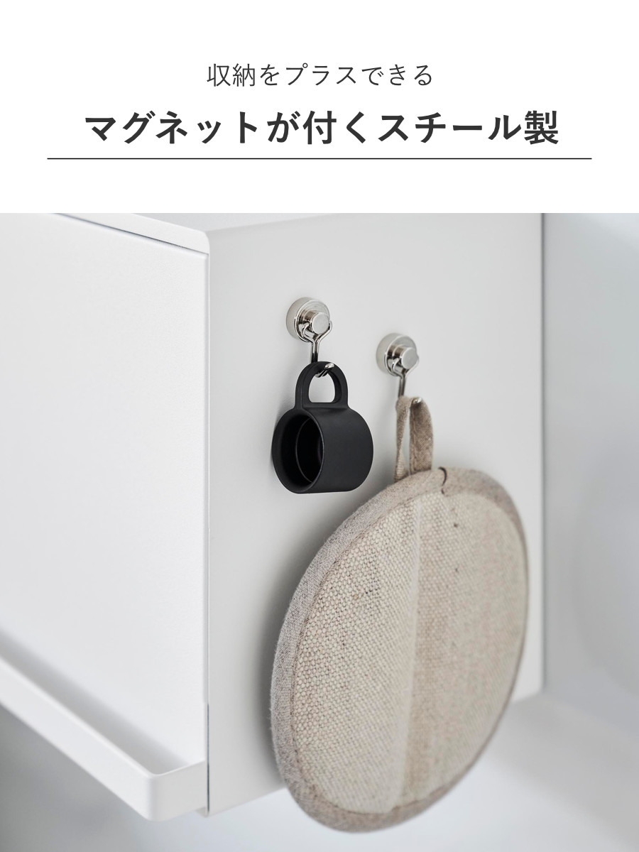 本体は汚れに強い粉体塗装を施したスチール製で、マグネットが付けられるので、メモやレシピを貼れます。また、マグネットフックを使えばちょっとした収納もプラスできます。