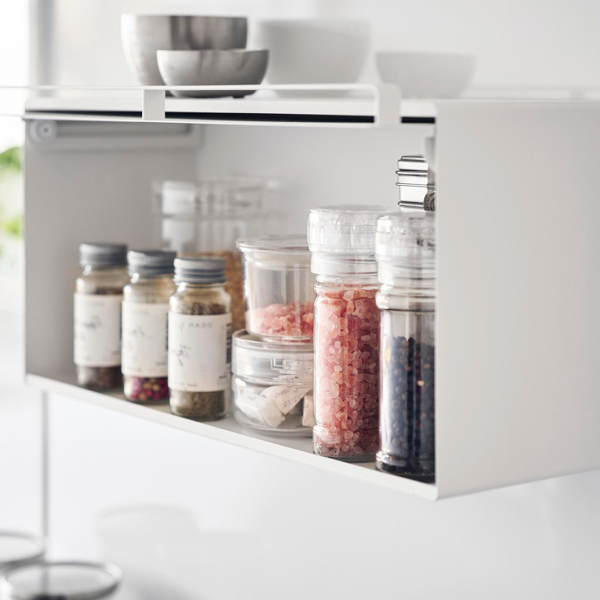 コンロの近くでは調味料の収納にも便利です。調理台を広く使うことができて、調理がスムーズに。天板には、計量カップやボウルなどキッチンツールも置けます。
