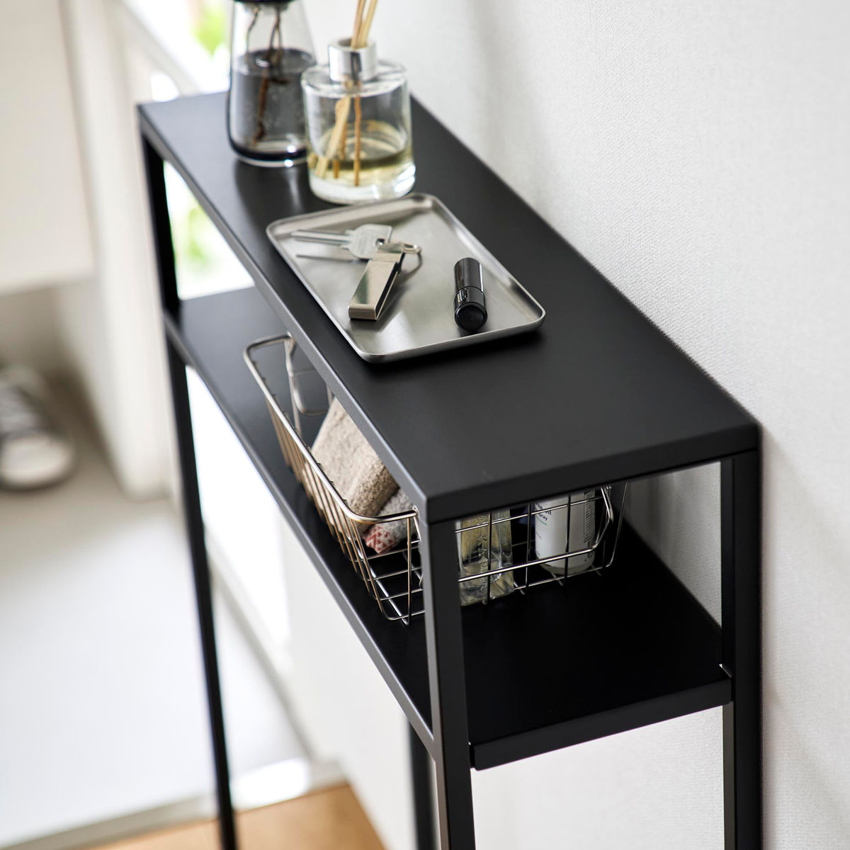 エントランスや廊下、リビングで活躍する棚付きコンソールテーブルです。ちょい置きやディスプレイに便利で、ディフューザーや小物置きとしてもぴったりです。奥行がスリムなので置く場所を選びません。