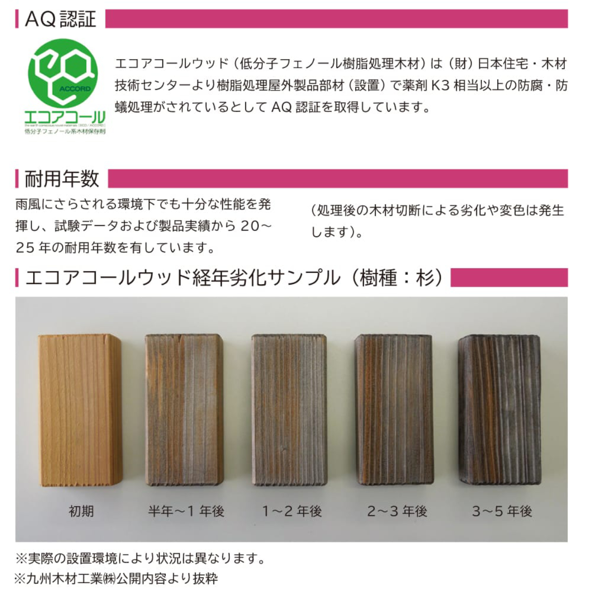 木材の短所である割れや腐敗を抑制した、新時代の保存処理木材「エコアコールウッド」を使用した木製ベンチです。低分子フェノール樹脂処理木材を使用しています。樹脂を木の中までしみ込ませているため、耐久性が高く、屋外でも安心してお使いいただけます。