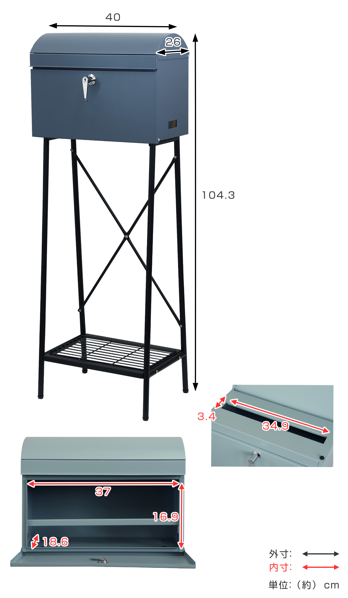 | サイズ | 約 幅40×奥行26×高さ104.3(cm) 投函口サイズ:約幅34.9×奥行3.4cm 取出口:約幅37×奥行18.6×高さ16.9cm |