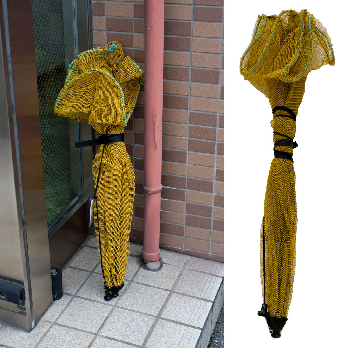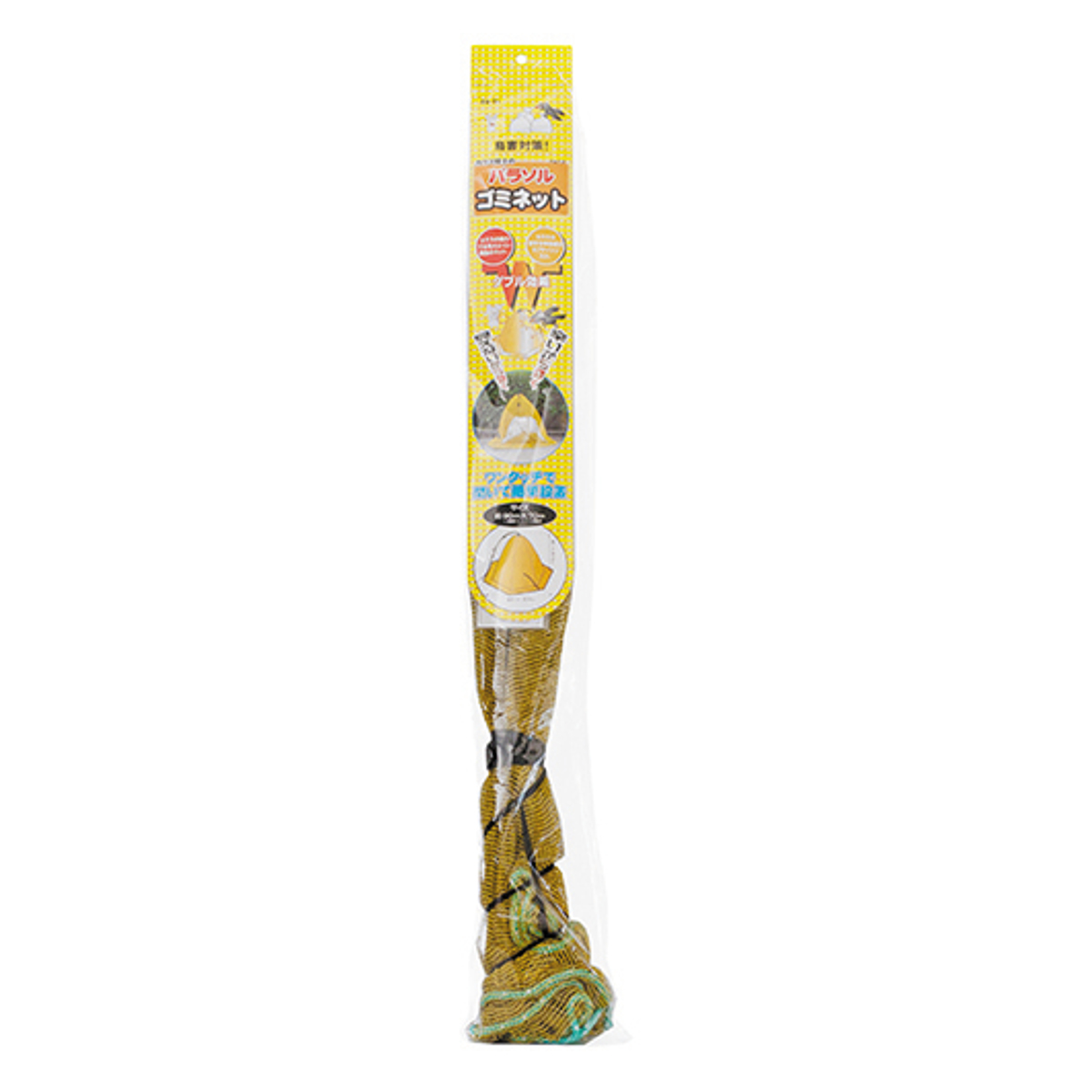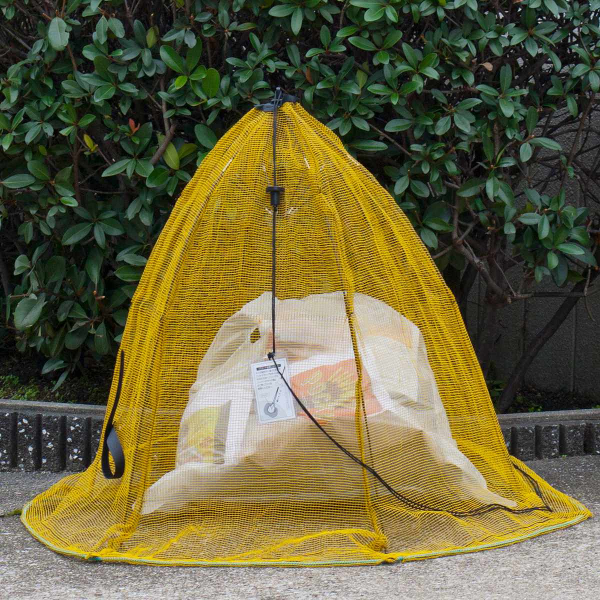 パラソル型の防鳥ゴミネットです。傘のようにパッと開き、上からかぶせるだけで簡単に設置できます。カプサイシン入りの黄色いネットがカラスの視界を妨げます。