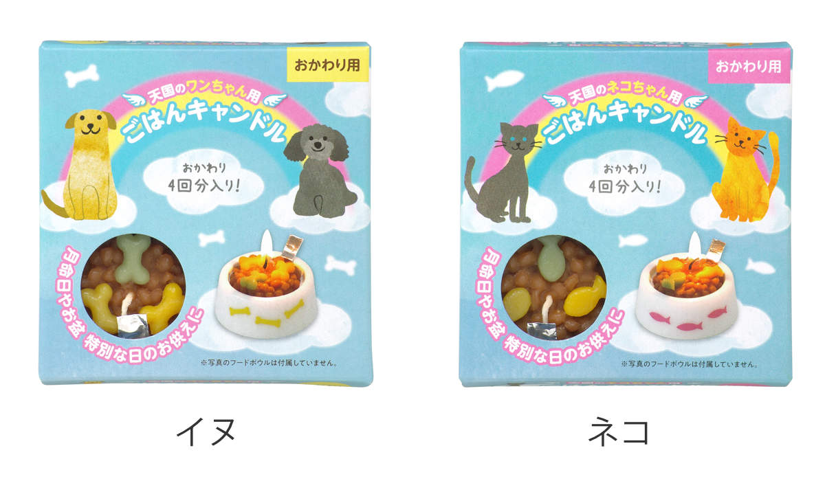 「ごはんだよ」と火を灯すと、嬉しそうな顔が思い浮かんでくる。虹のかなたで待っているワンちゃん・ネコちゃんのための特別なキャンドルです。月命日やお盆、お誕生日など、行事ごとに灯すキャンドルとしておすすめです。