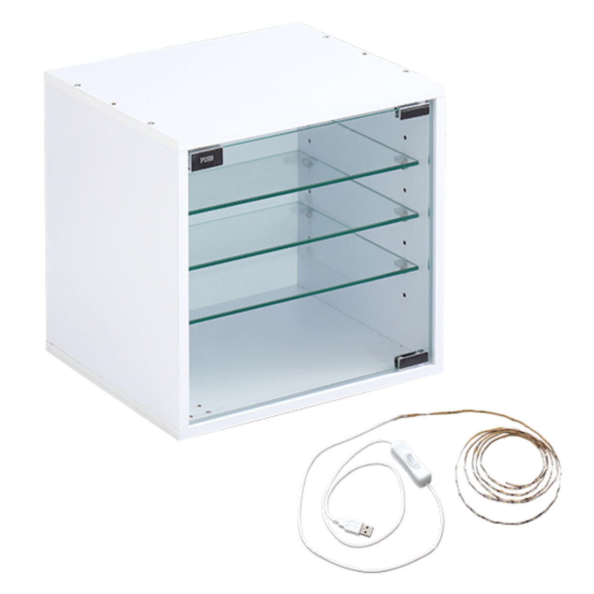 LEDテープライトがセットになっているため、別途照明を用意する必要がありません。ライトで光を添えることで、飾ったアイテムを印象的に見せられます。