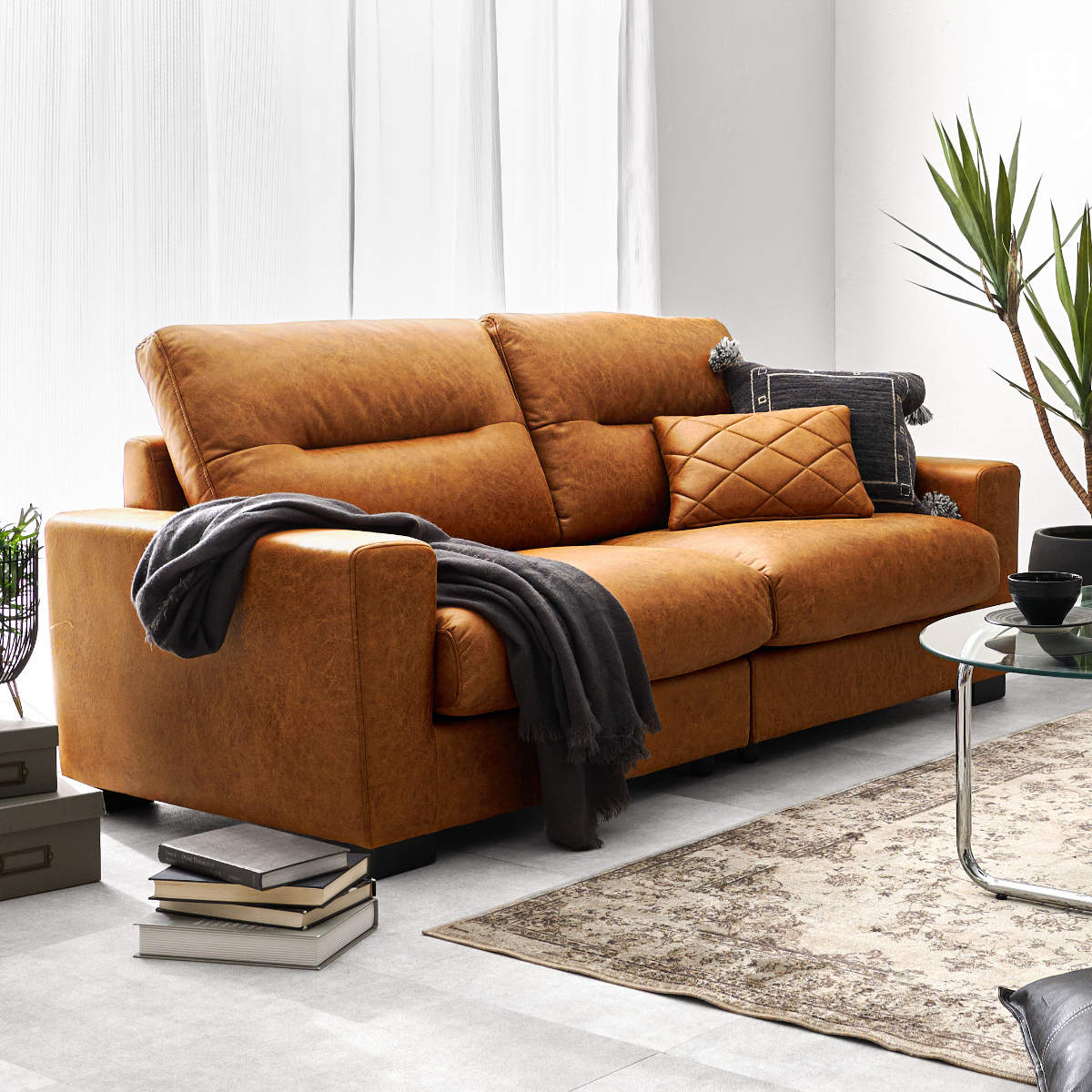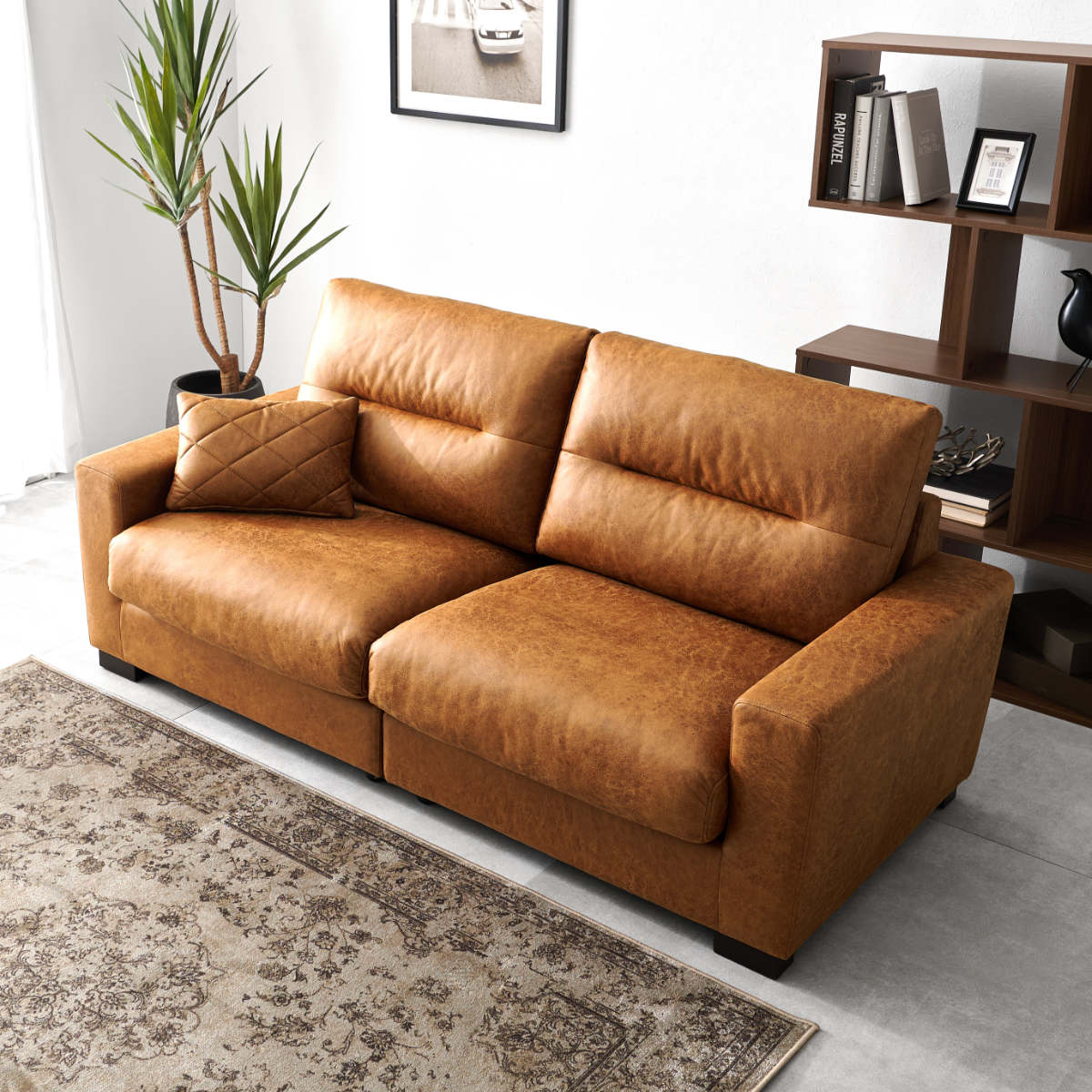 存在感のあるボリュームと張りのあるフォルムが空間を引き締めるヴィンテージレザー調の3人掛けソファ。広々としたワイドな座面で、体格を問わずゆったり身体を預けられ、長時間でも快適にくつろげます。