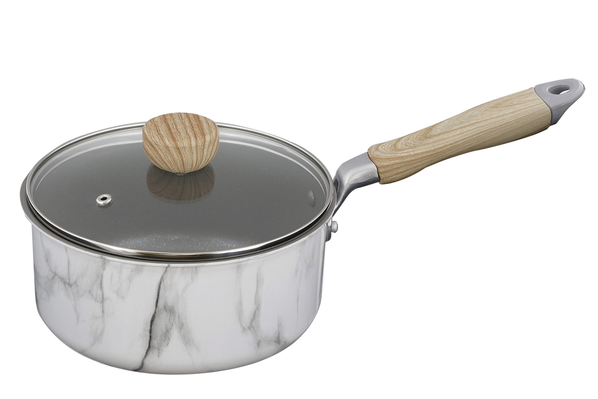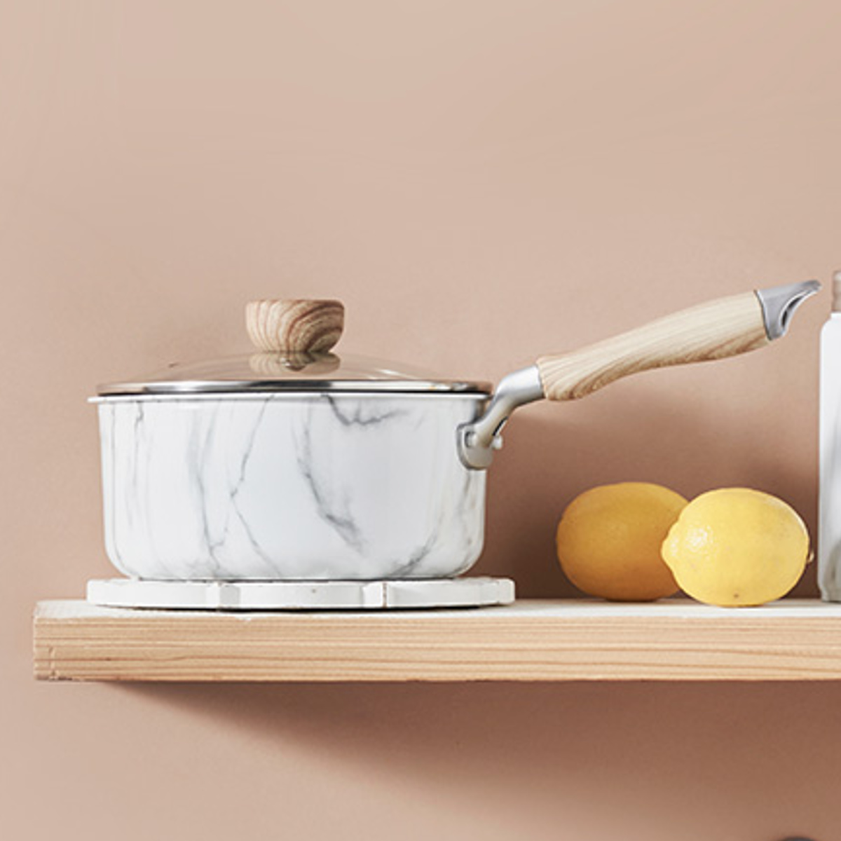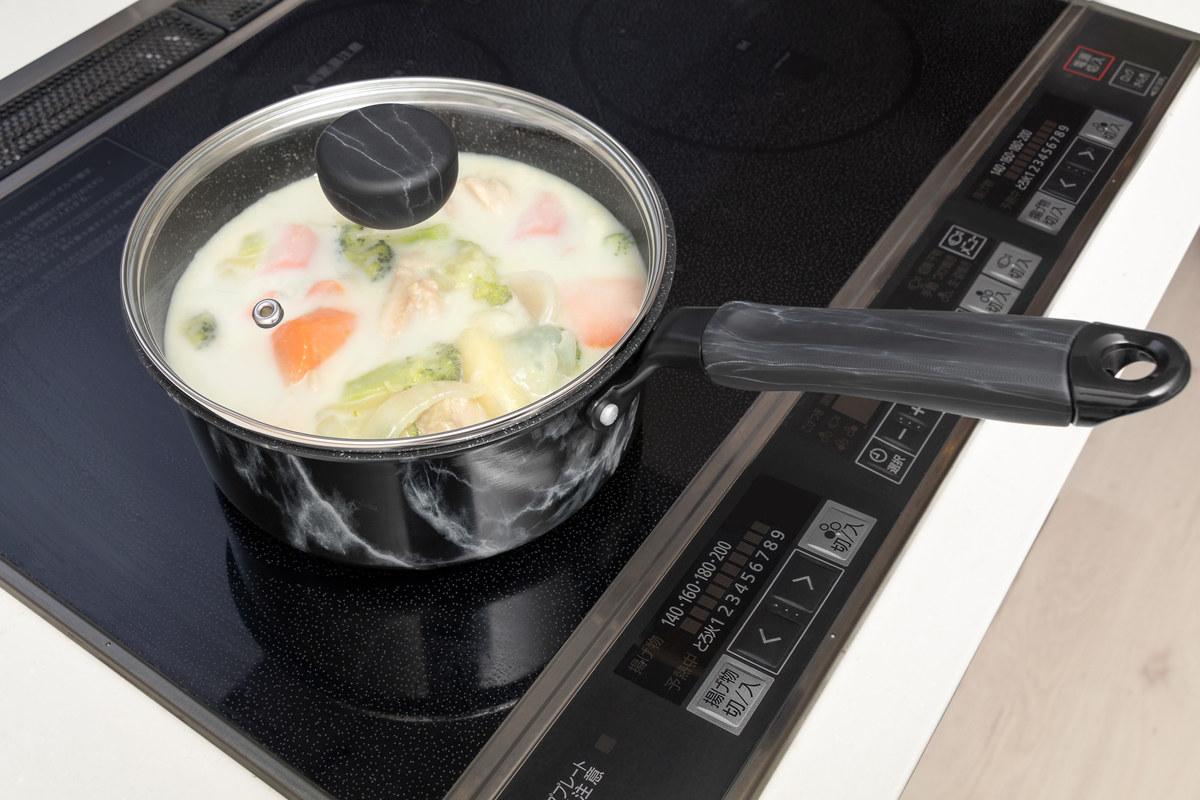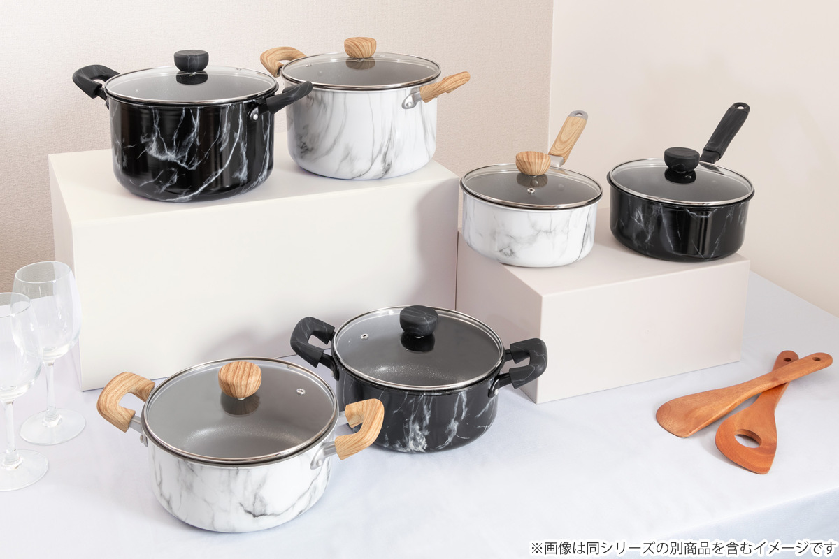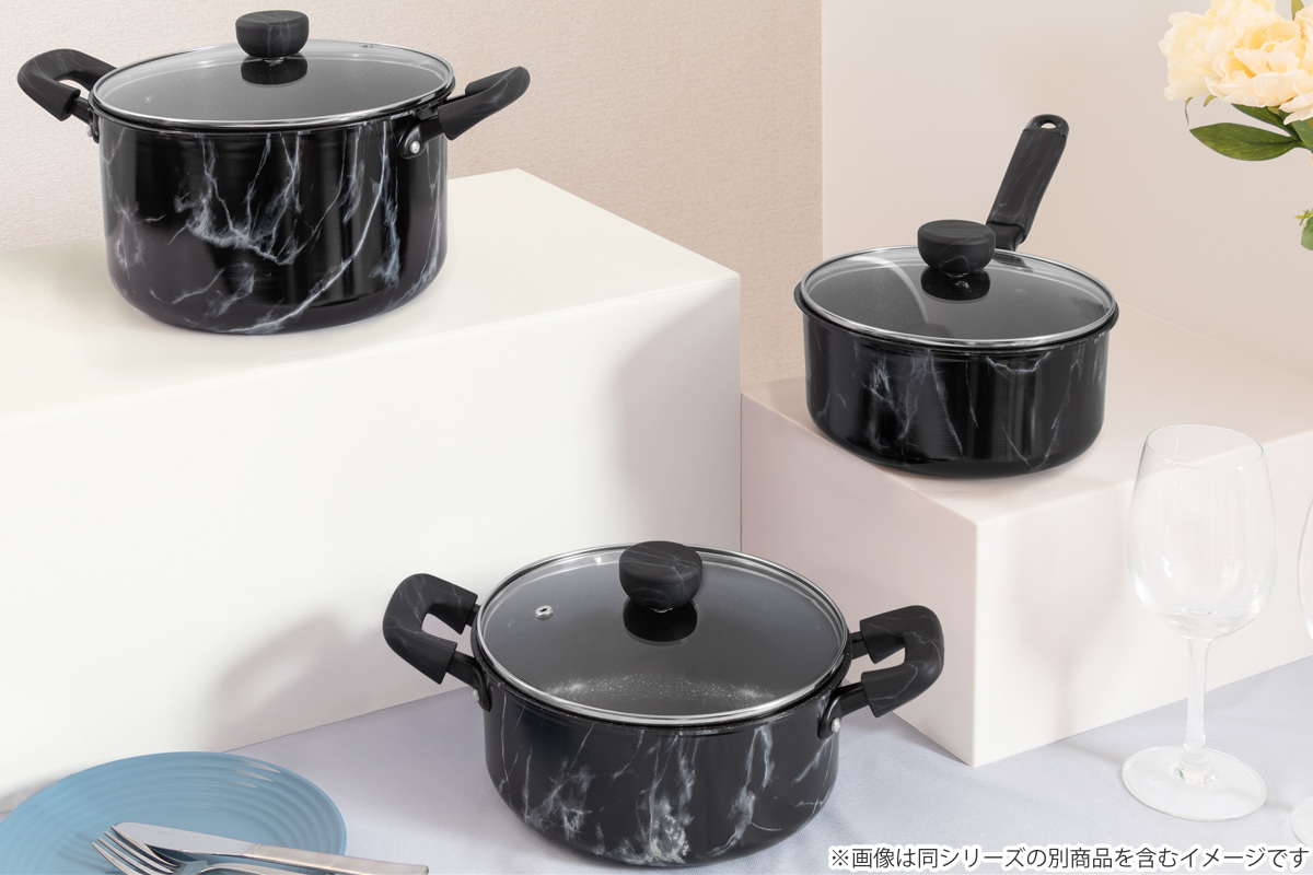 大理石模様が目を引く、オシャレなソースパンです。表面には高度な技術を用いた上品な大理石調デザインを施し、調理中も収納時も洗練された印象を与えます。