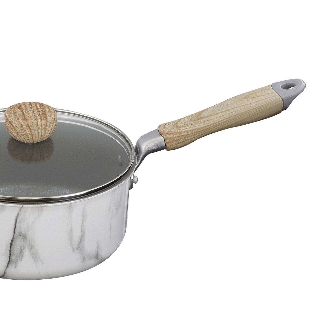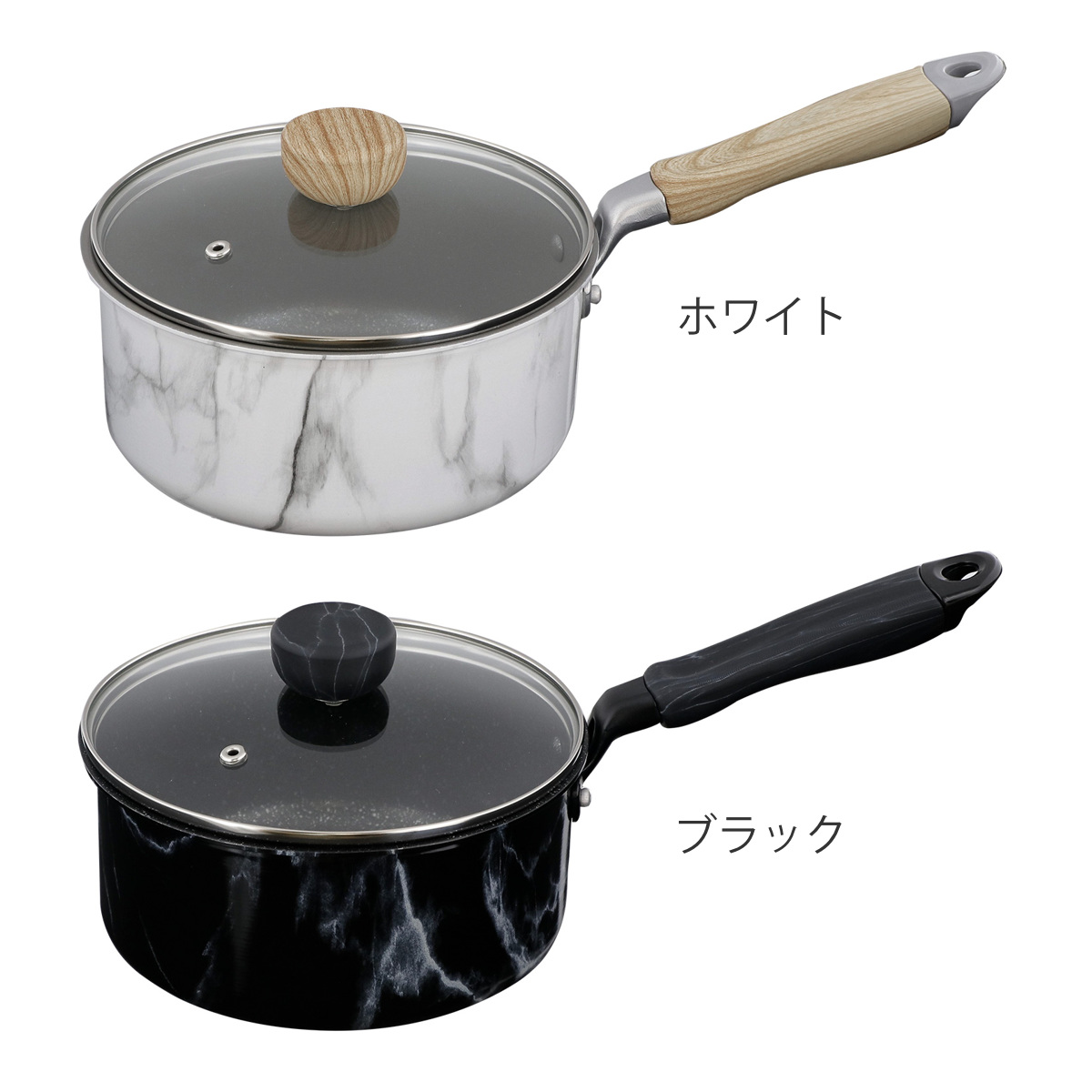 片手鍋 18cm IH対応 ふっ素樹脂加工 MARBLE KITCHEN ソースパン ( ガス火対応 オール熱源対応 片手なべ 鍋 ガラス蓋付き ふっ素加工 軽い 18センチ アルミ製 こびりつきにくい 軽量 大理石柄 おしゃれ ) 【ホワイト】